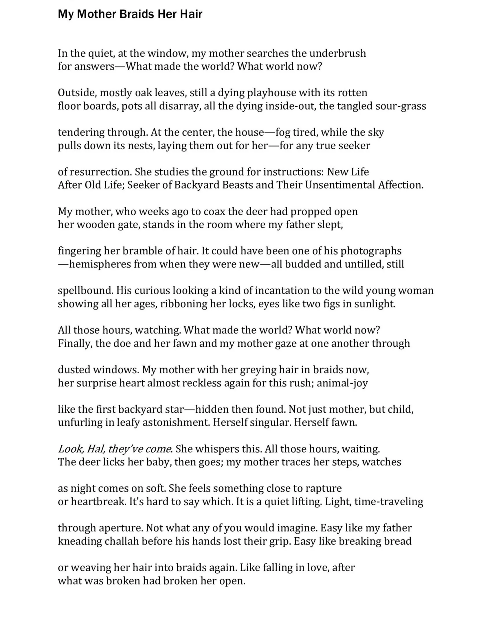 These poems sit with a mother in the aftermath of a loss. They consider what lasts and what shifts; what it means to bear witness and how we might hold such moments ourselves. They celebrate the essential child-self that carries aliveness and hopefulness within. As loss moves through us, how are we changed? And how, if we are lucky, do we go on— tilting and re-tilting the prism of perception, opening new chambers of the heart?