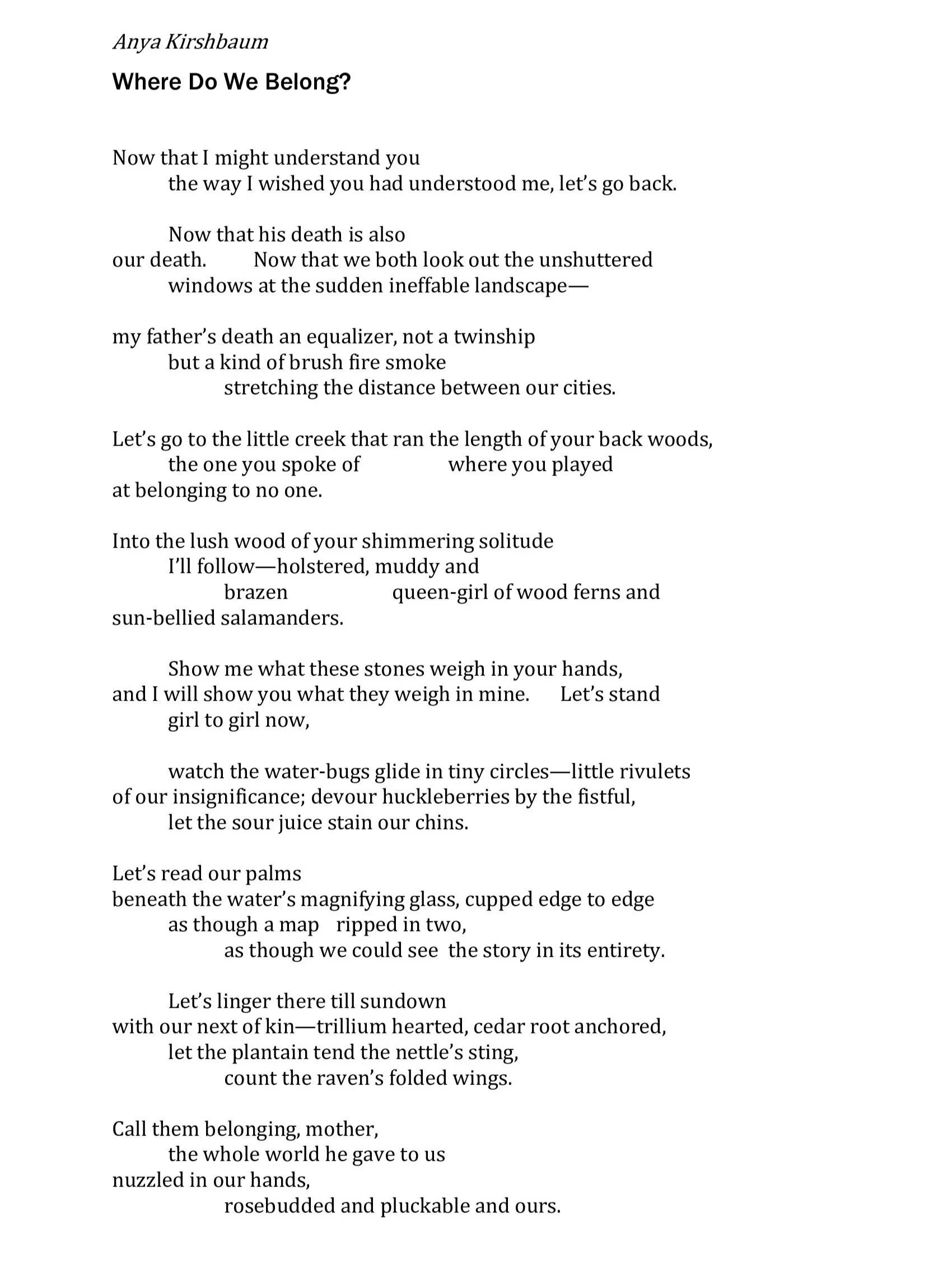 Anya Kirshbaum is a queer poet and somatic therapist living in Seattle, Washington. Her work has appeared in The Comstock Review, Cirque, MER-Mom Egg Review, Crannóg and Solstice Literary Magazine. She was a finalist for the New Millennium Writing Awards and was the recipient of the 2023 Banyan Poetry Prize.