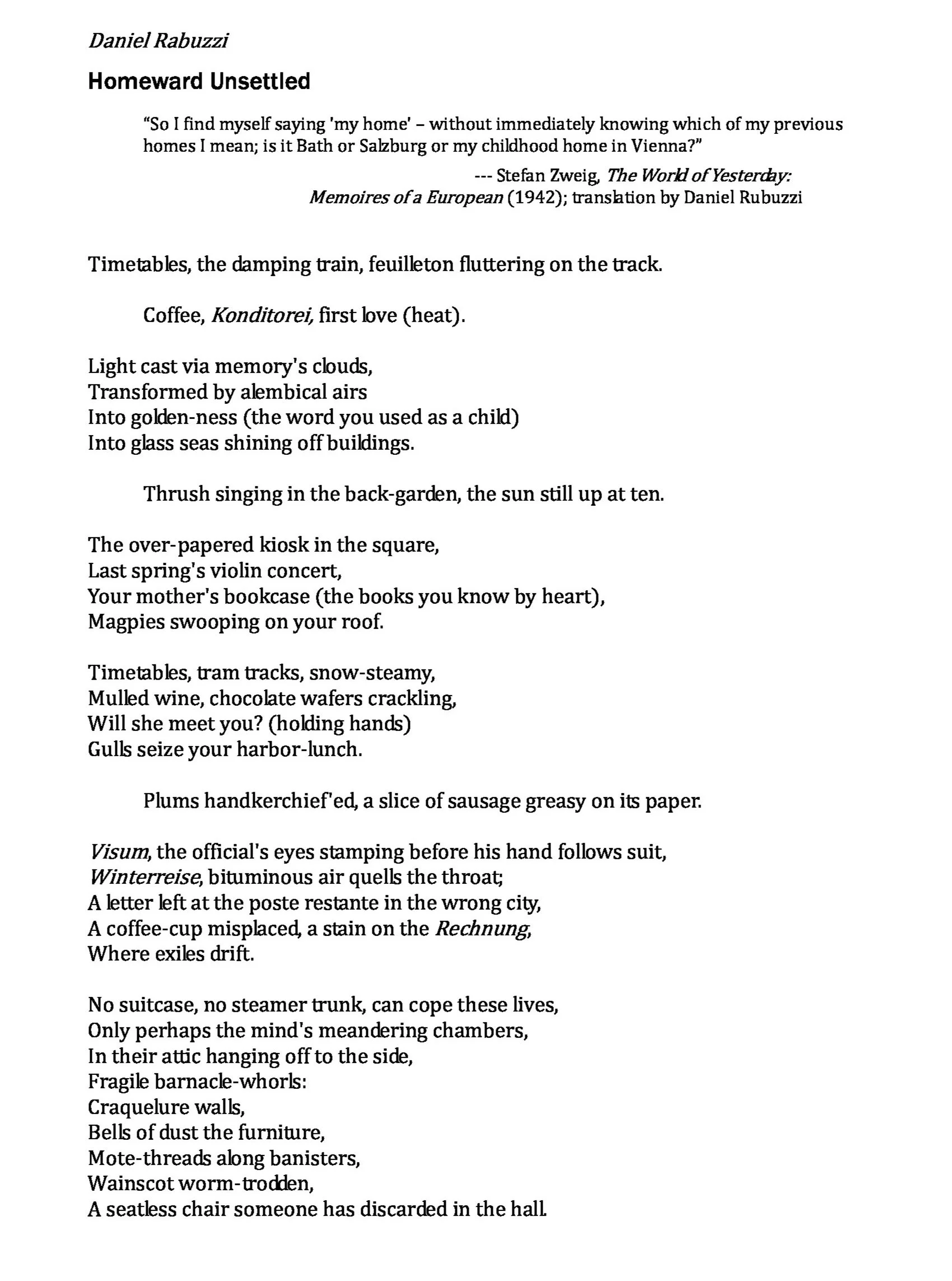 “Stefan Zweig's elegiac description of a home (an entire culture) lost resonates today more than ever: I finished this poem during the first week of the Ukrainian refugee crisis. One challenge is to recall a cherished past without sentimentality or grandiloquence. Another is to preserve but not petrify the past, to make it a living legacy. I contemplate these challenges in “Homeward Unsettled.””