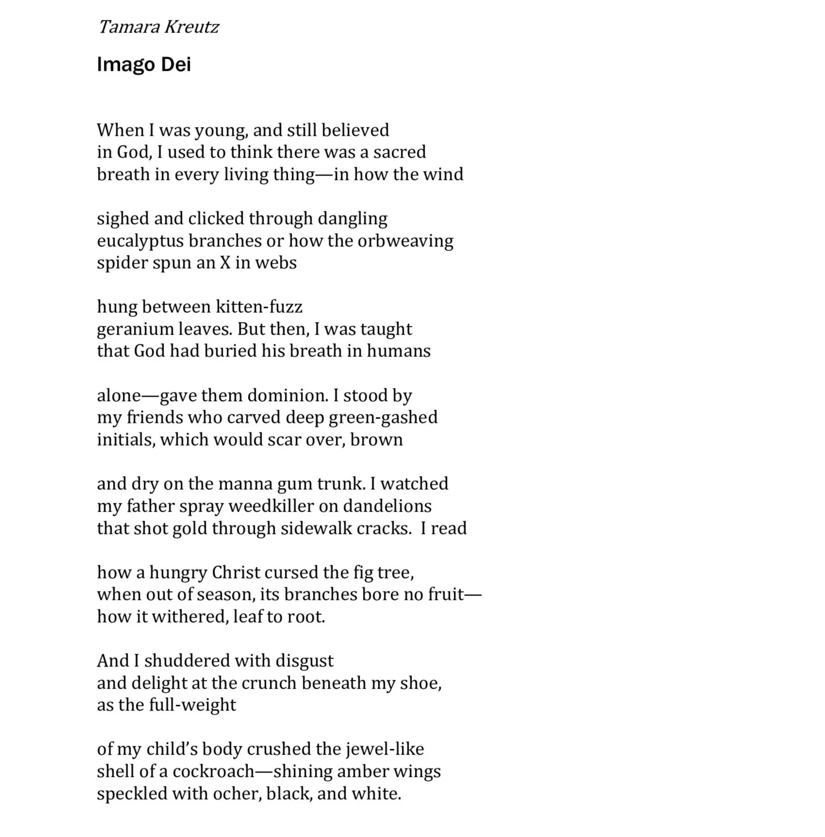 Tamara Kreutz lives with her family in Guatemala, where she teaches at an international school. Tamara is an MFA candidate at Pacific University. Her work has been featured in Poets Respond by Rattle, Calyx, and Chestnut Review, among other publications.