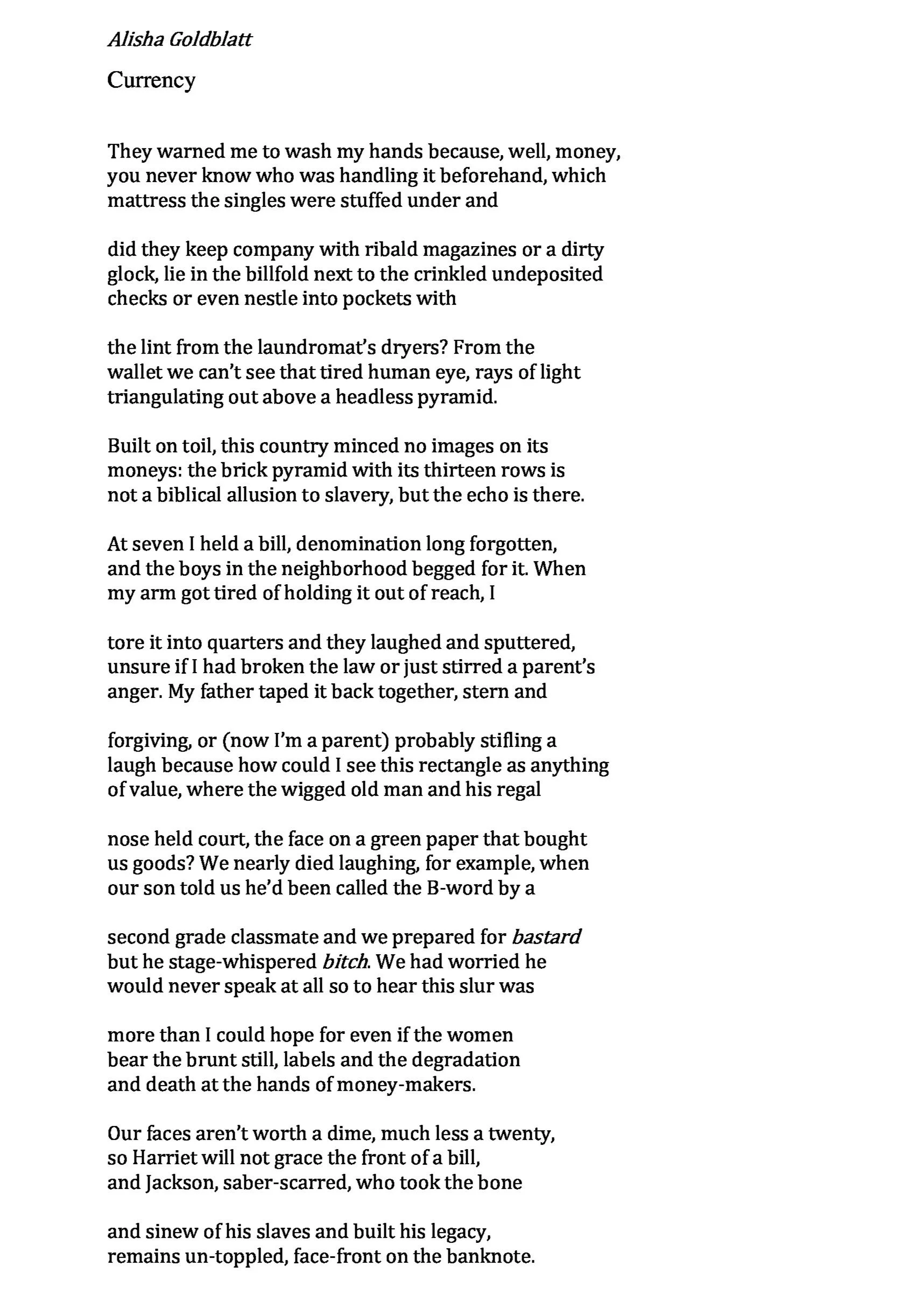 Alisha Goldblatt is an English teacher and writer living in Portland, Maine with her two wonderful children and one lovely husband. She has published poems in the Common Ground Review, Literary Mama, and Burningword Literary Journal, among many others, and several essays in other journals.