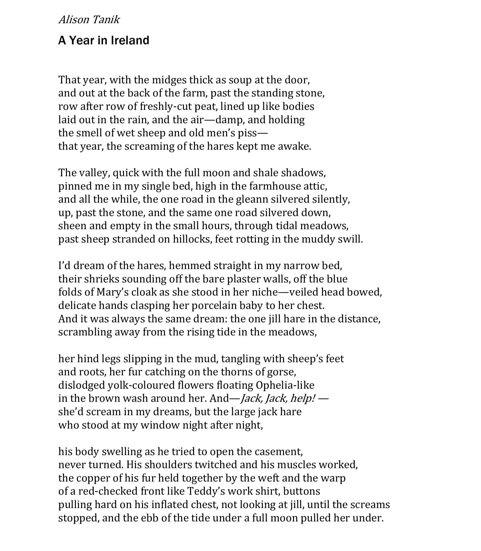 I attended a workshop facilitated by Pascale Petit in which participants were given random animals to write about—I got the hare, and this poem was born. I wove facts about hares into a dream-like narrative set in Ireland. The use of hares and the narrow valley allowed me to explore themes recurrent in my work: violence against women and sexual desire. I also leant on the anthropomorphism of jack hares in popular culture.
