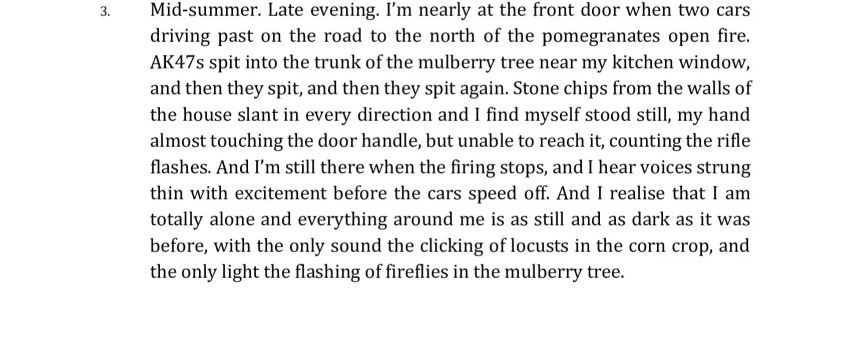 Some poems are composed in ways that resonate with their content so as to amplify and sustain their music. “My house is slipstreamed” is a prose poem in three parts—three seasons, three different times of day—all in one humble and vulnerable voice. The war that floods around and past the speaker’s house sweeps the lone dweller up in a private storm of witness, and the poem in turn slipstreams us. The absurdity of the tide of mass violence sings from the magic machine of this box of moments, and leaves our cores calling for that peace “when the firing stops,…the only light the flashing of fireflies in the mulberry tree.”