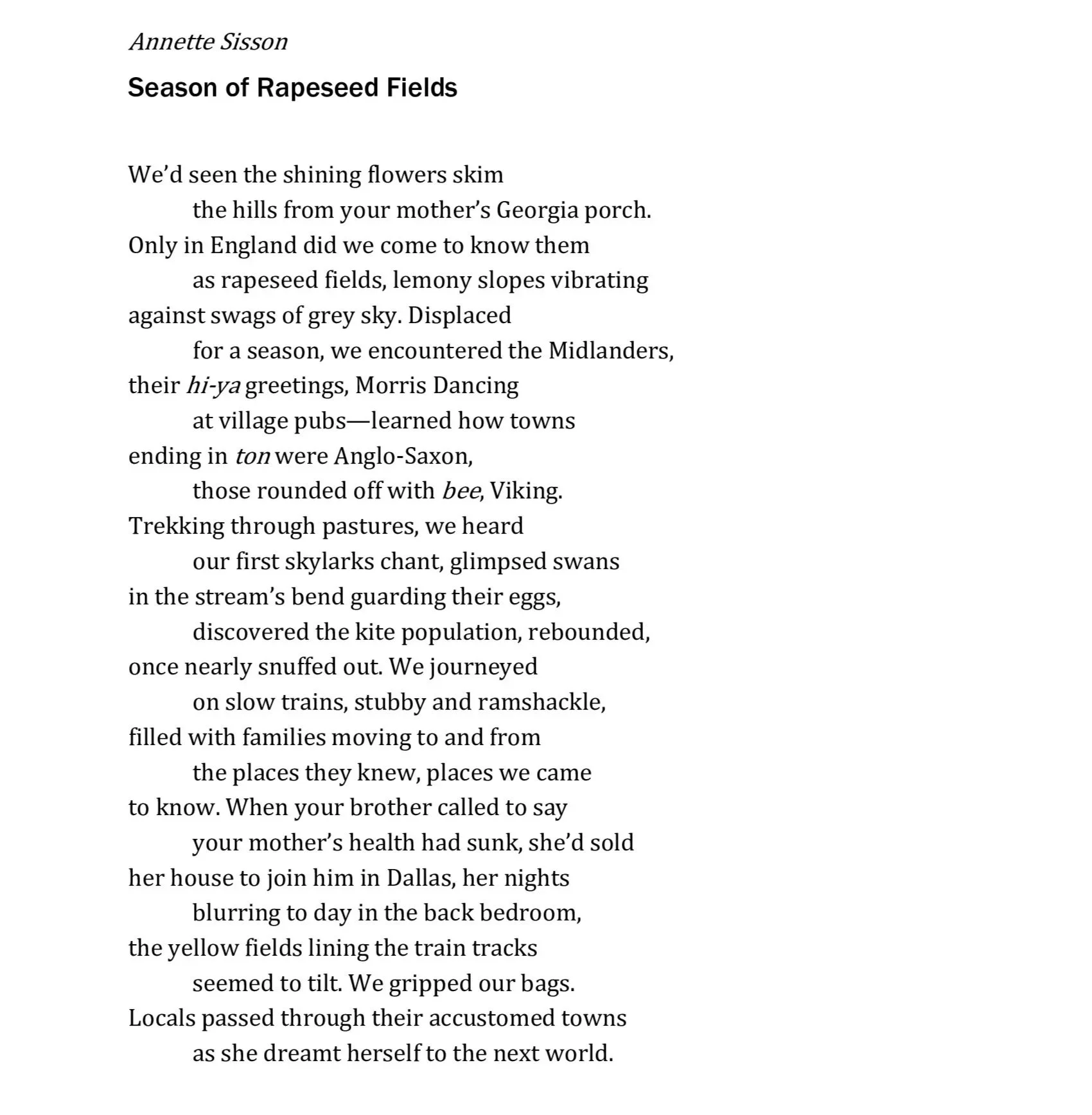 In 2022, my husband and I taught 30 university honors students in Lincolnshire, England from early January until the end of April. We all lived and taught courses at Harlaxton Manor, adjacent to Harlaxton Village, and from the manor, we could see the rapeseed fields glowing in the distance under cloudy, grey skies. We often took long walks to small towns and villages and spent our free time on trains and busses traveling to small cities, places we’d never seen on previous London-centered trips. We were not natives, but our lives developed a regular rhythm, and we experienced daily life in the countryside. All the elements of “Season of Rapeseed Fields” are rooted in those four months, including, sadly, the decline of my mother-in-law, who passed away one week before our scheduled return.