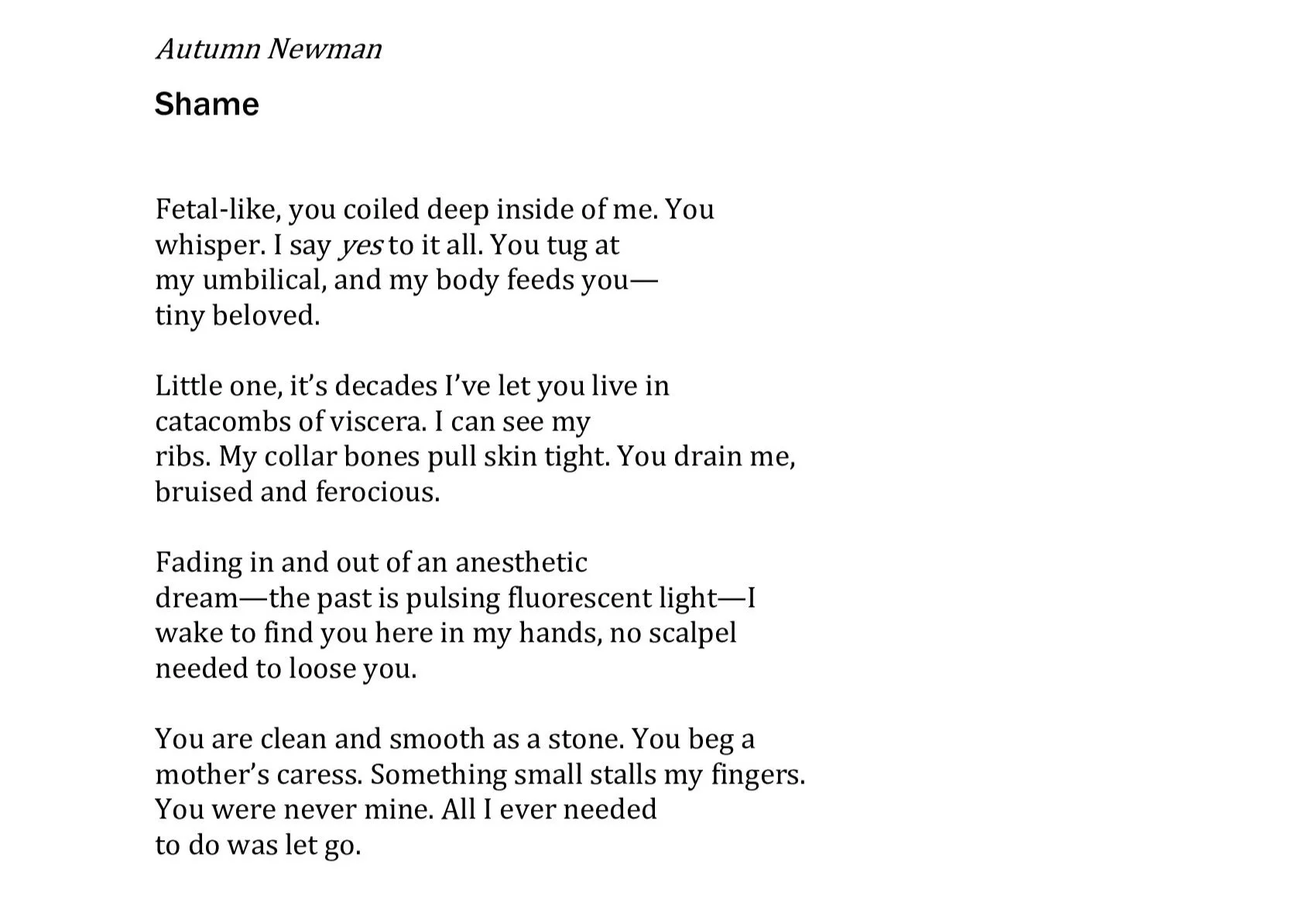 Autumn Newman’s poems have recently appeared or are forthcoming in Cider Press Review, Pratik, Rise Up Review, The Orchards Poetry Journal, The Tiger Moth Review, The Rising Phoenix Review, and River Heron Review. Her chapbook, This Is My Body, A Flower Burst Open, is forthcoming from Finishing Line Press.