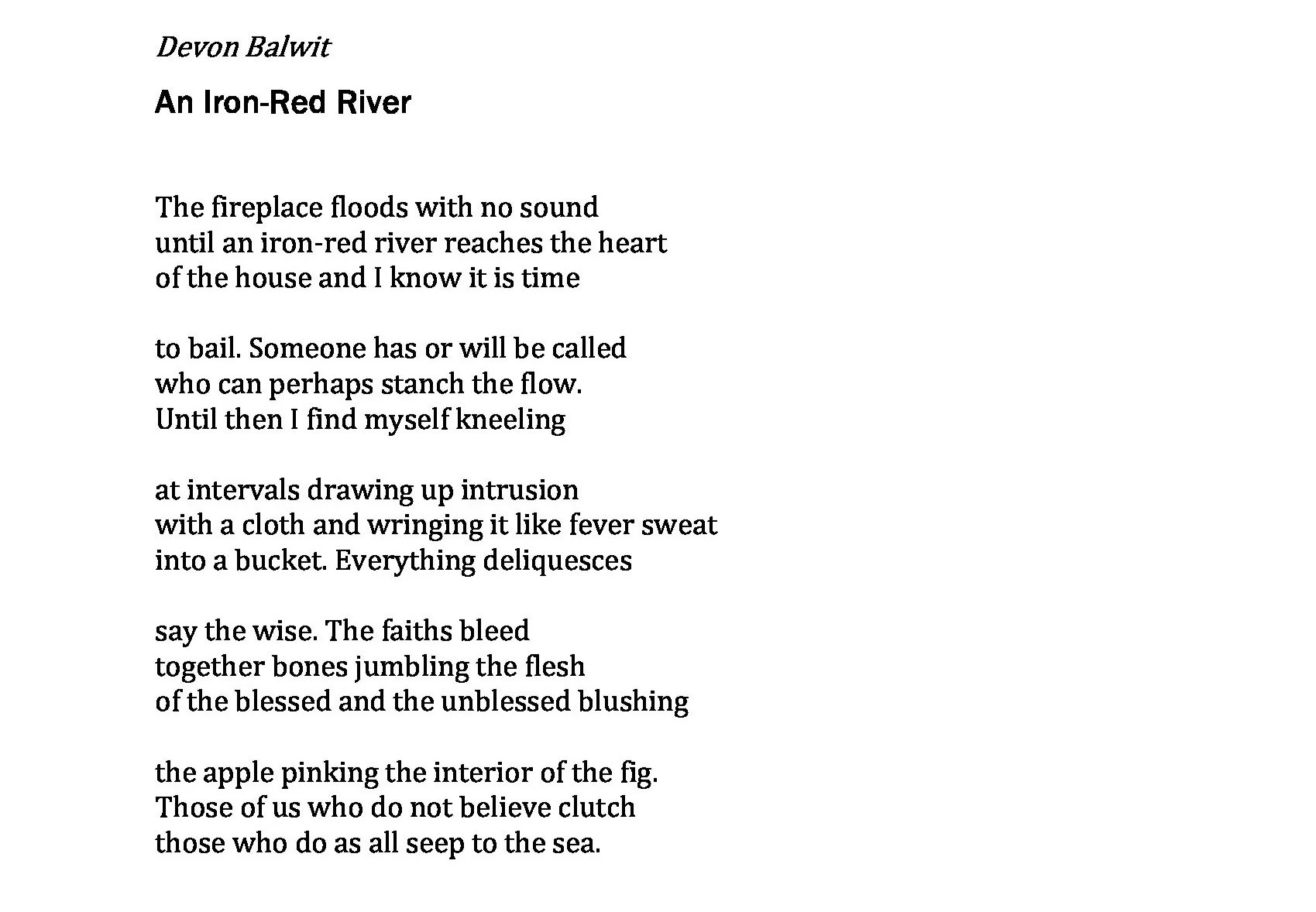 Devon Balwit walks in all weather. Recent collections are Rubbing Shoulders with the Greats [Seven Kitchens Press 2020] and Dog-Walking in the Shadow of Pyongyang [Nixes Mate Books, 2021].