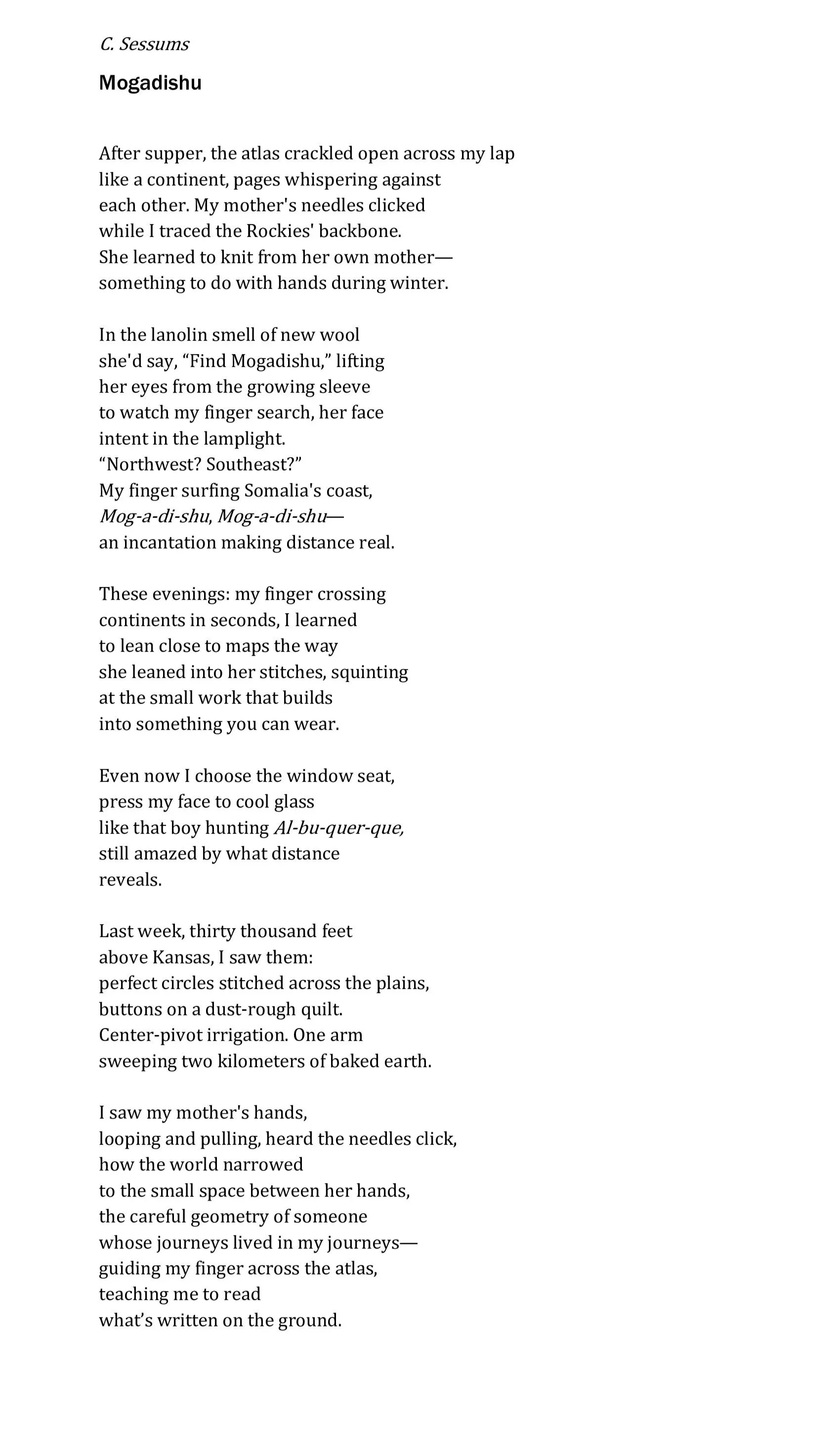 Christopher Sessums is an emerging poet based in Maine. While studying at the University of Florida, he took poetry courses with William Logan and Debra Greger. He now works at Colby College and stays active in the Maine literary community, attending readings in Portland and Waterville and regularly consulting with poet Adrian Blevins. He reads widely, subscribing to and devouring Ploughshares, The New England Review, AGNI, and The Kenyon Review. His current favorite poets include Richard Siken, Henri Cole, Ocean Vuong, and Jenny Molberg.