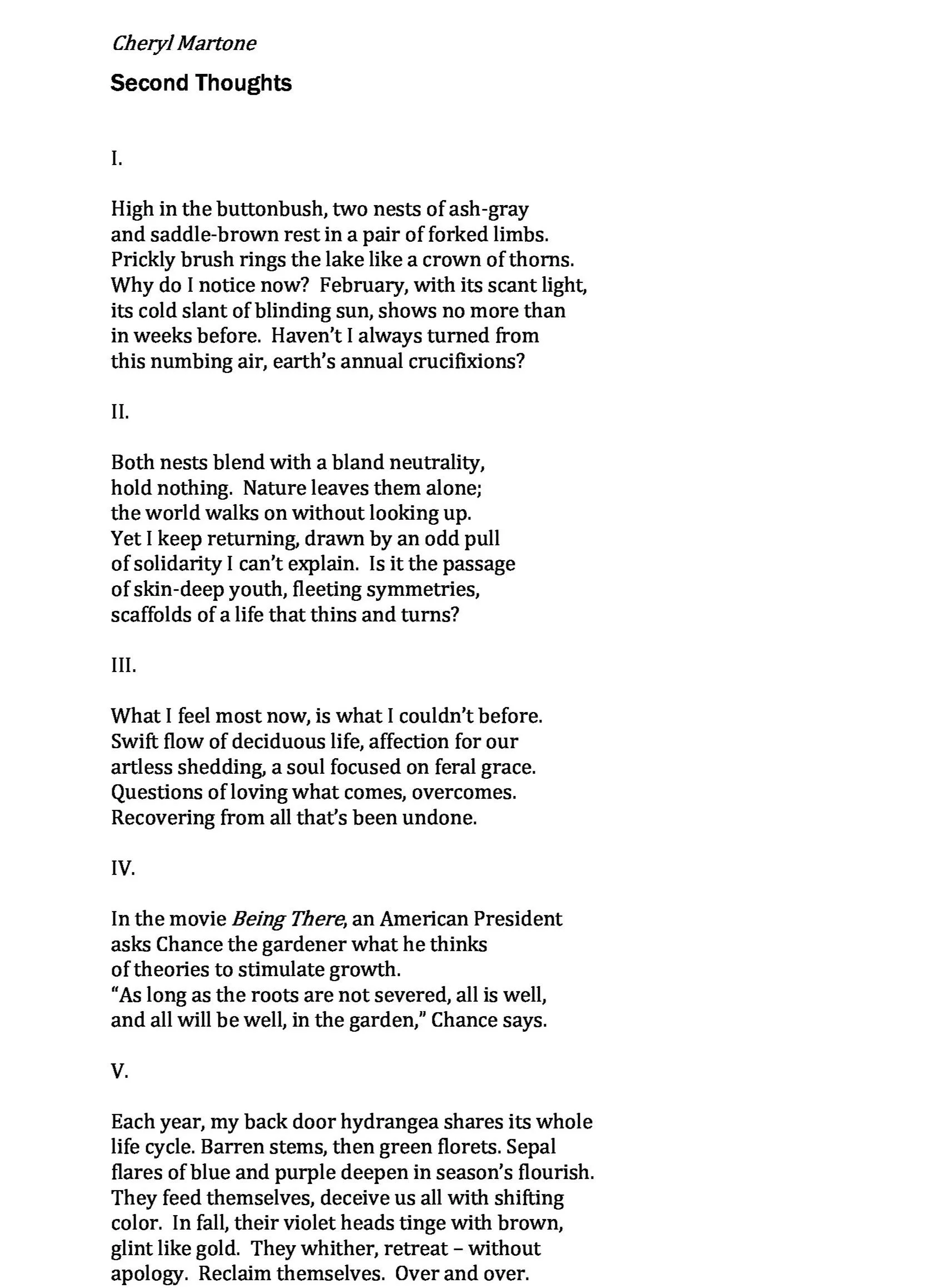 Cheryl Martone lives and writes in Rhode Island. She recently retired after a 36-year career in public service. Her writing is endless inspired by the outdoors, art, questions of perspective, and small moments of observation in the human and natural worlds.
