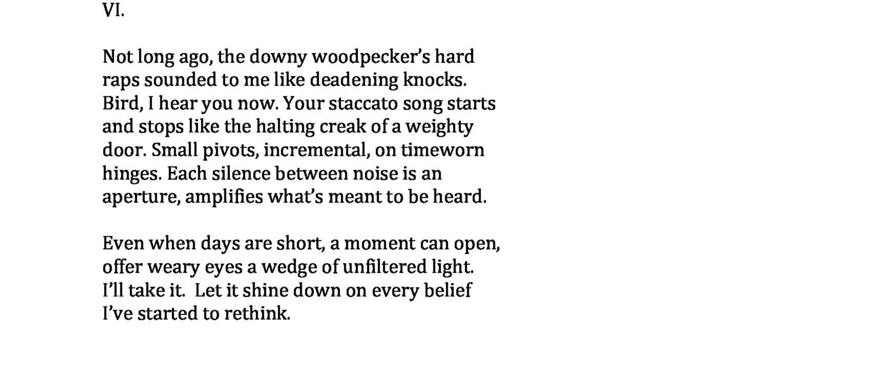 “This poem started during a February 2021 walk, while listening to Ten Percent Happier podcast host Dan Harris interview author Adam Grant about his book Think Again. Their conversation, titled “The Joy of Being Wrong”, was about the wisdom of rethinking long-held opinions, questioning assumptions, cultivating flexibility, and welcoming surprising new perspectives – even if humbling. Excellent reinforcement mid-pandemic, when so many of us were already reassessing the world and our view of it.”