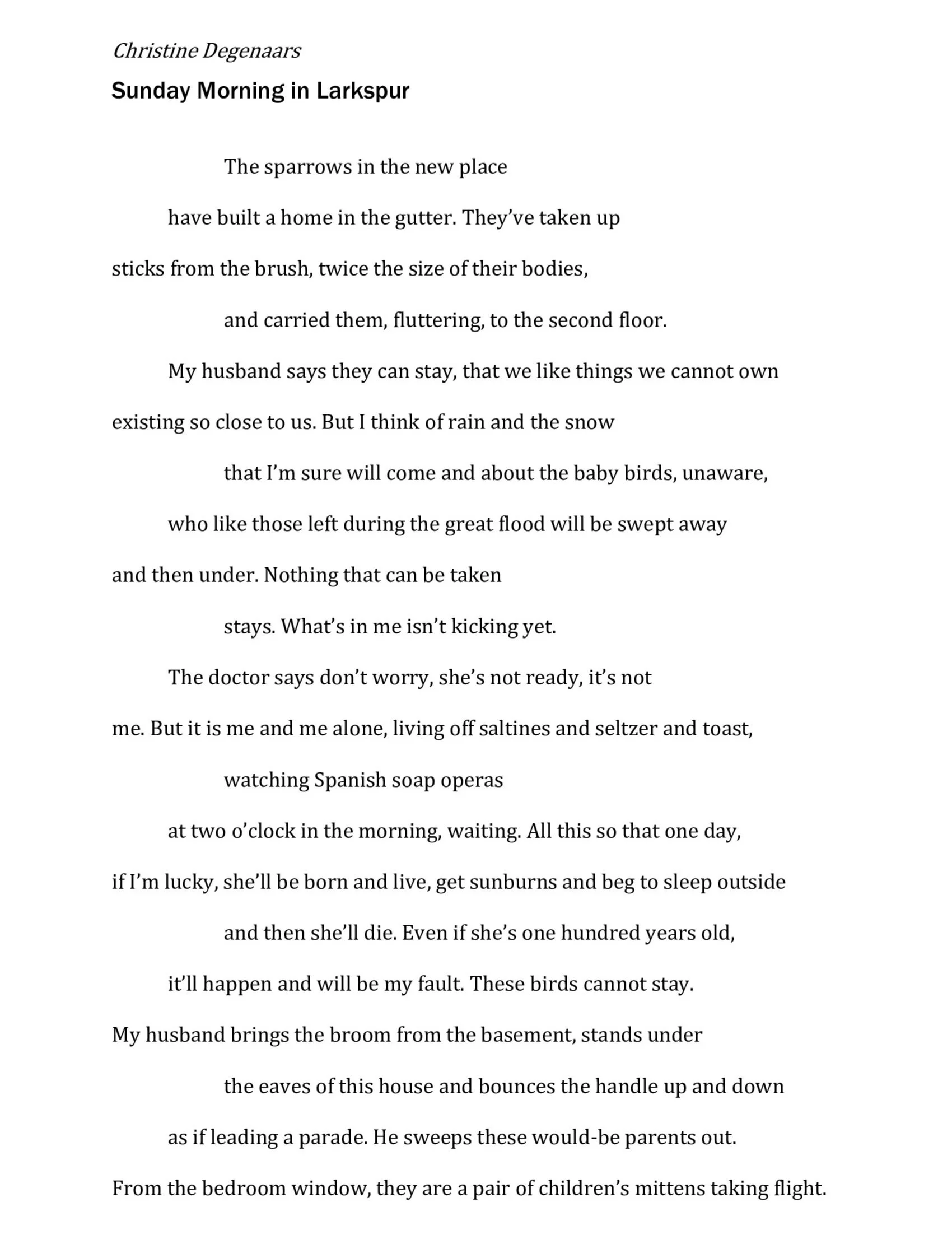 Christine Degenaars has work published in Rattle, Tar River Poetry, Epiphany, Cider Press Review, and elsewhere. She was nominated for the 2023 Pushcart Prize, and in 2022 was selected as a semi-finalist in the 92Y Discovery Poetry Contest. She graduated from Hunter College with a Master of Fine Arts in Poetry. Thin Glass, her debut collection, will be published by Fernwood Press in 2025. She lives in New York.