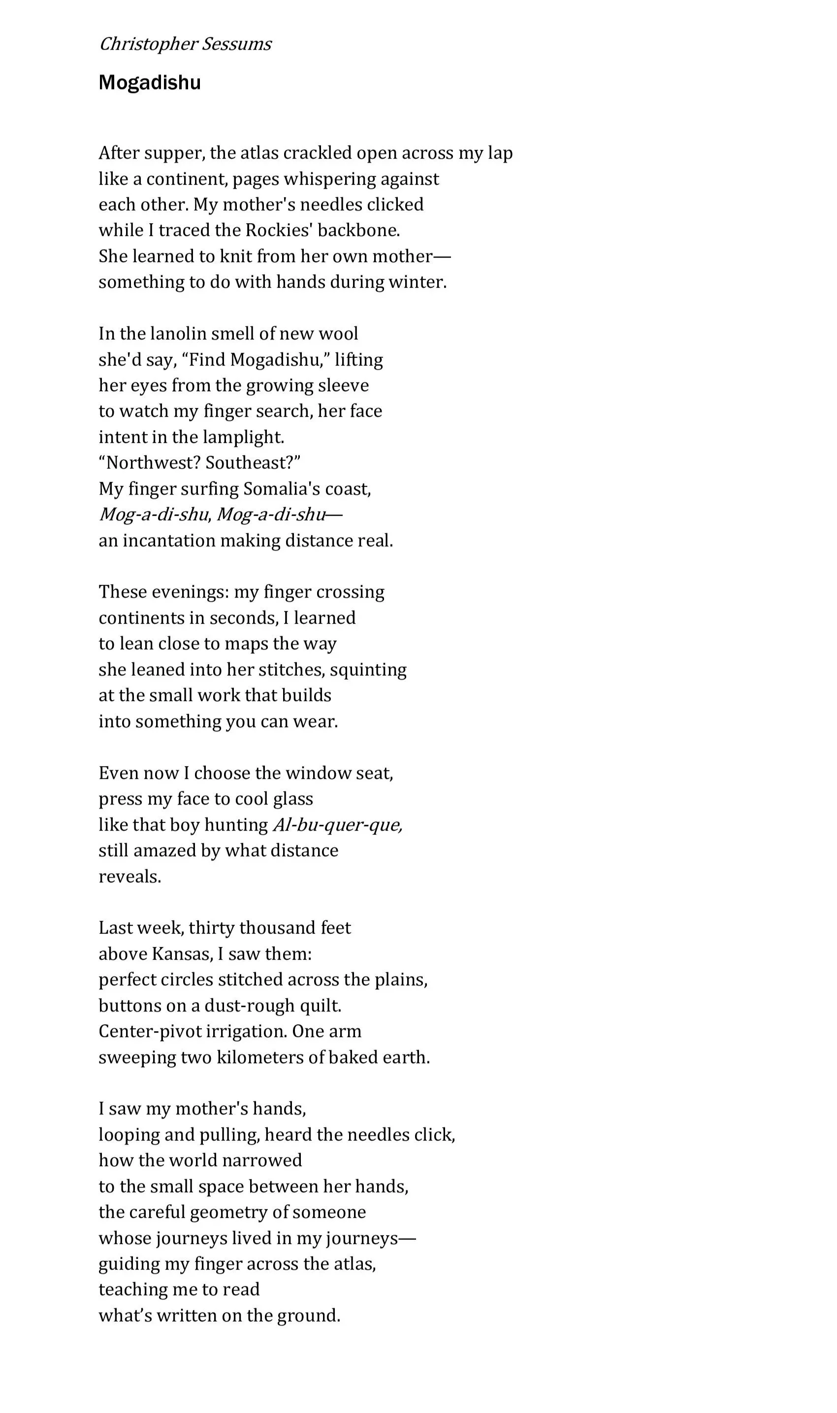 Christopher Sessums is an emerging poet based in Maine. While studying at the University of Florida, he took poetry courses with William Logan and Debra Greger. He now works at Colby College and stays active in the Maine literary community, attending readings in Portland and Waterville and regularly consulting with poet Adrian Blevins. He reads widely, subscribing to and devouring Ploughshares, The New England Review, AGNI, and The Kenyon Review. His current favorite poets include Richard Siken, Henri Cole, Ocean Vuong, and Jenny Molberg.