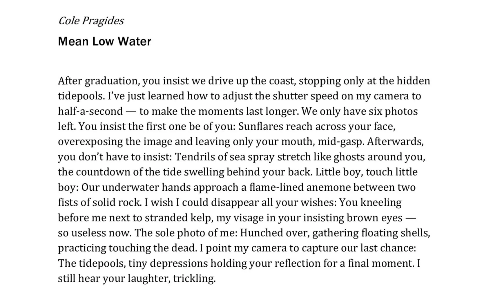 “Mean Low Water” is inspired by a formative friendship lost to mental illness. The piece takes place in a landscape of constant transition, surrounded by waves of guilt and grief bounding in constructive interference. The reader is forced to accept the certainty and inevitability of the rising tide. The set of memories I present were never photographed and preserved. Instead, they have been transmuted and distorted by time, sea spray, and the Northern California fog.