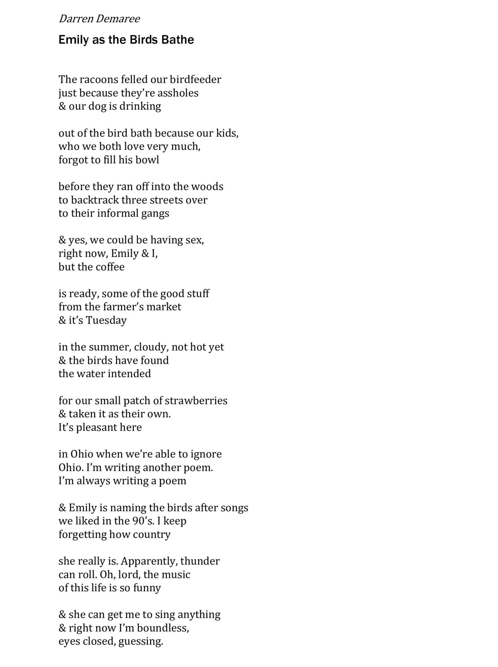 I think these “Emily as…” poems work best when they're ornery and domestic, when they want so loudly that the echoes bounce off the walls of our house and our full life together. Marriage is hard, but it's hysterically funny. Sex is wonderful, but it's silly and rushed sometimes when you have children. The complexities of a life can fade away, and it's just two people singing the wrong words to an old song. It can be lovely and true amidst a climate that is anything but those things.