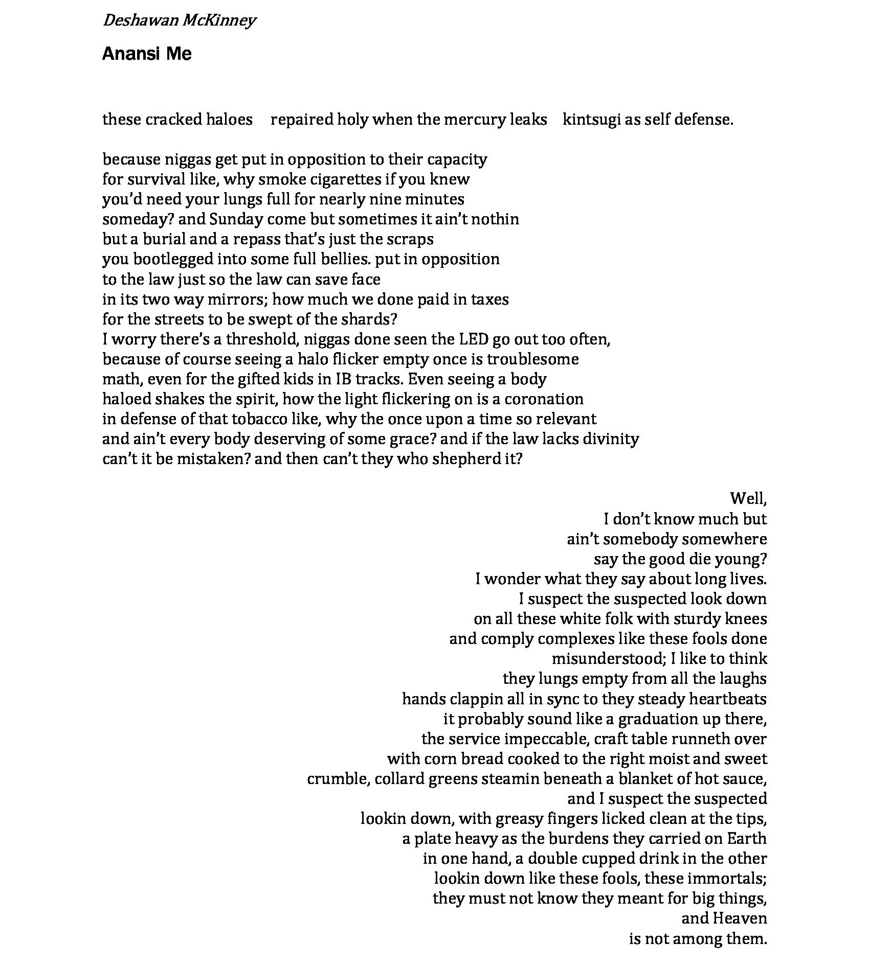 Particularly poignantly, the poem evokes internalized oppression—how inequity can lead to self-harm. Craft elements such as the title (evoking a trickster and survivor and whose stories were transmitted through the slave trade) and structure (an embodiment of the divide between those lost and those still here) add to the overall impact.