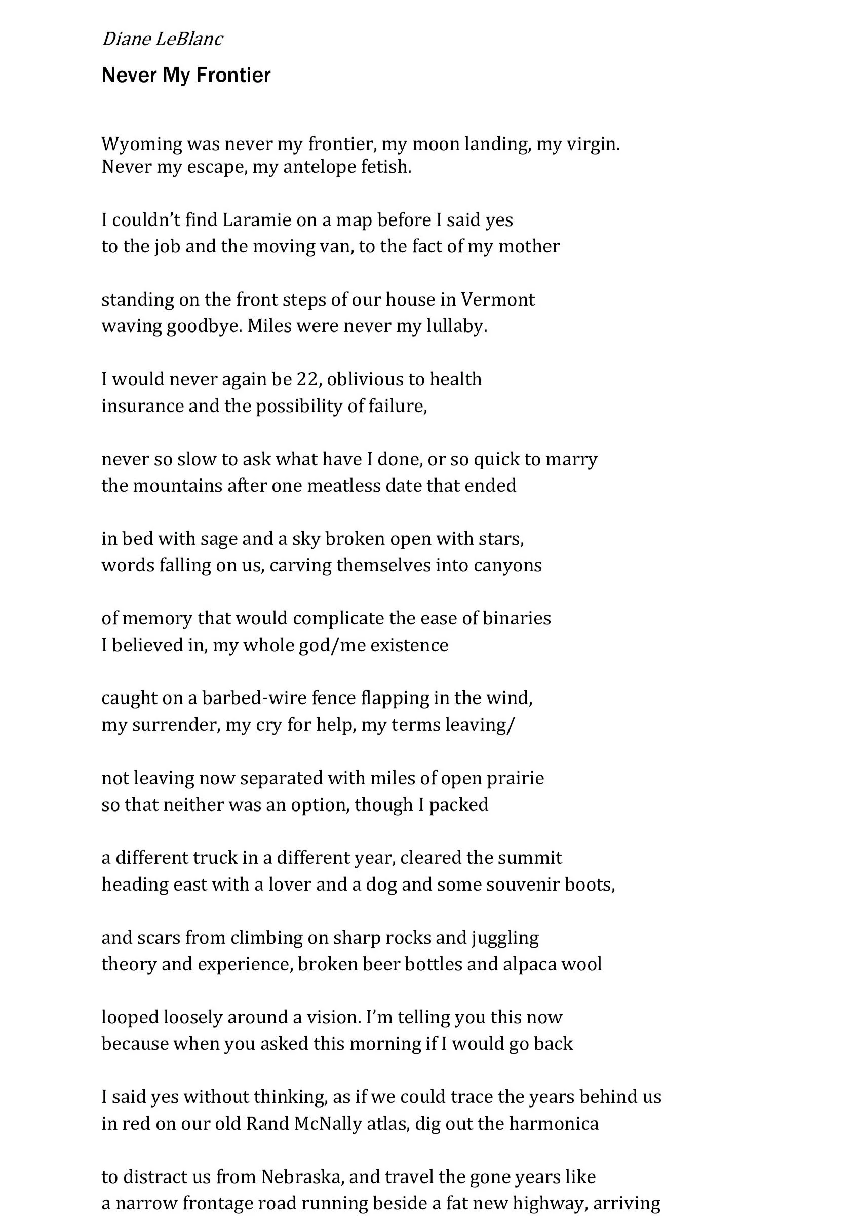 I value this poem’s compelling complexity and difficulty. After living with “Never My Frontier” for weeks, holding still with it so often, examining under the microscope the intricate details of its formal, linguistic, figurative and rhetorical innovations, I’m still not sure exactly how to read this poem nor how it might be pigeonholed into neat categories and classifications so as to nail down its meaning(s) definitively. But isn’t that part of the larger point? Poetry should “resist the intelligence, almost,” says Wallace Stevens, and so does LeBlanc it seems. Just like Wyoming, “Never My Frontier” resists and rejects simple labels, facile categorizations, “the ease of binaries,” and the certitudes of straightforward definition. “Wyoming was never my frontier, my moon landing, my virgin,” chimes the speaker in the opening stanza, only to stretch her this string of (anti)comparisons further yet: “Never my escape, my antelope fetish.” How curiously inviting to begin this cross-country adventure via an introductory via negativa. So we ask, What, then, was Wyoming? If prior to her westward journey, Wyoming was a terra incognita, a nothingness, unlike any of the known things suggested by her catalogue of (anti)metaphors, then by poem’s end, oh how memorably, how beautifully the speaker has unfurled her vision of Wyoming. The images and figures that form this vision become a vehicle for apprehending what is present and what is haunting in the presence of things. The vision charts a geography of the heart and head which is as fleetingly sharp as the sight of a Wyoming night sky above a lightning-flashed prairie. There’s no doubt in the speaker’s mind (as ours) that the whatness of Wyoming is as substantial and elusive as that scrap of her former self and convictions “caught on a barbed-wire fence flapping in the wind.”