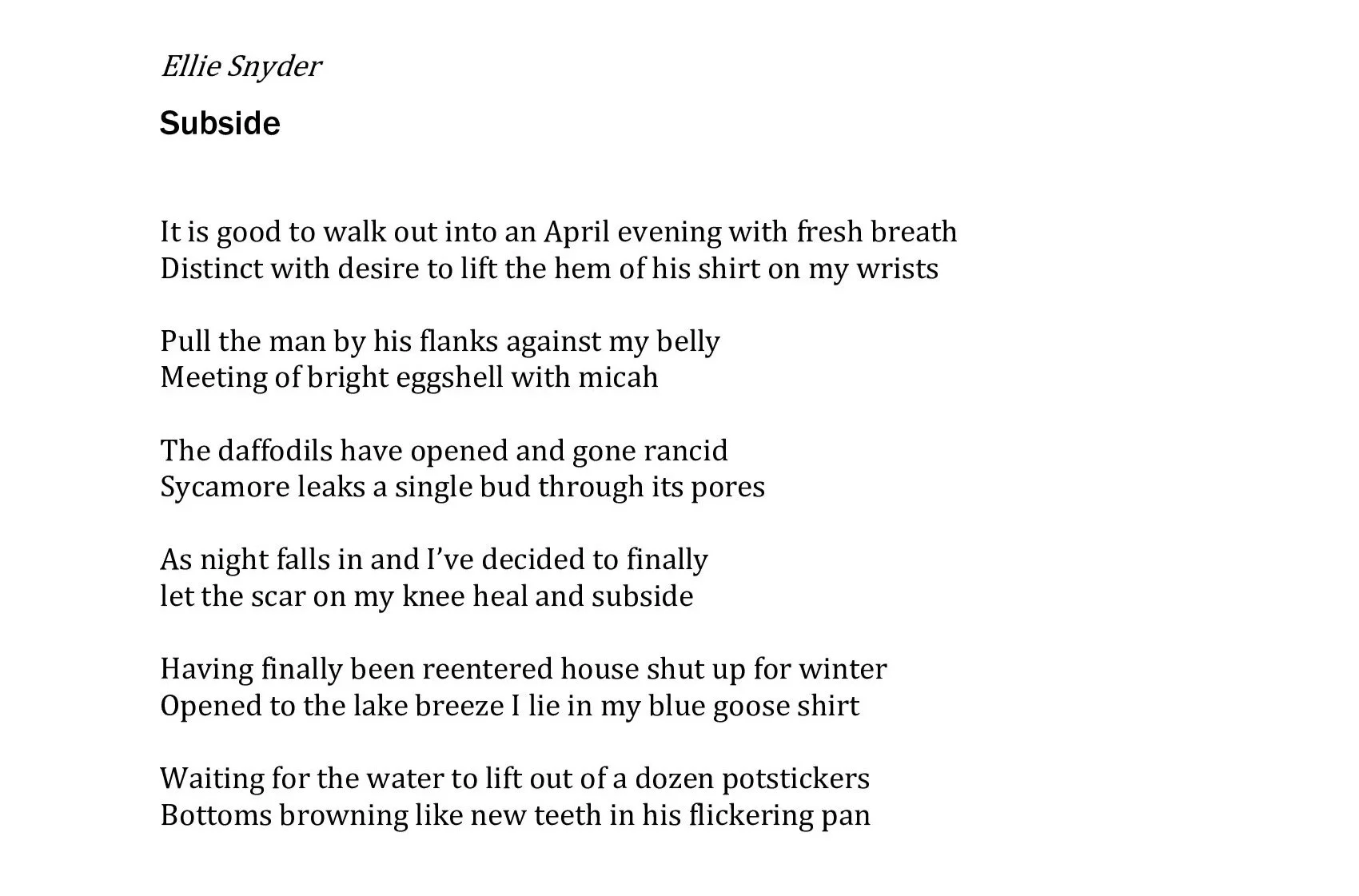“Subside” is about emerging from hibernation. Literally, it’s a springtime poem, April bringing out the first flowers and warming the weather enough to open windows. But it’s also about a certain reentry into the world, of potential love, of centered self, after a period of physical and emotional difficulty that has sent the speaker—as strife does so many of us—into self-imposed isolation. This is a soft, tentative return to a blooming world.