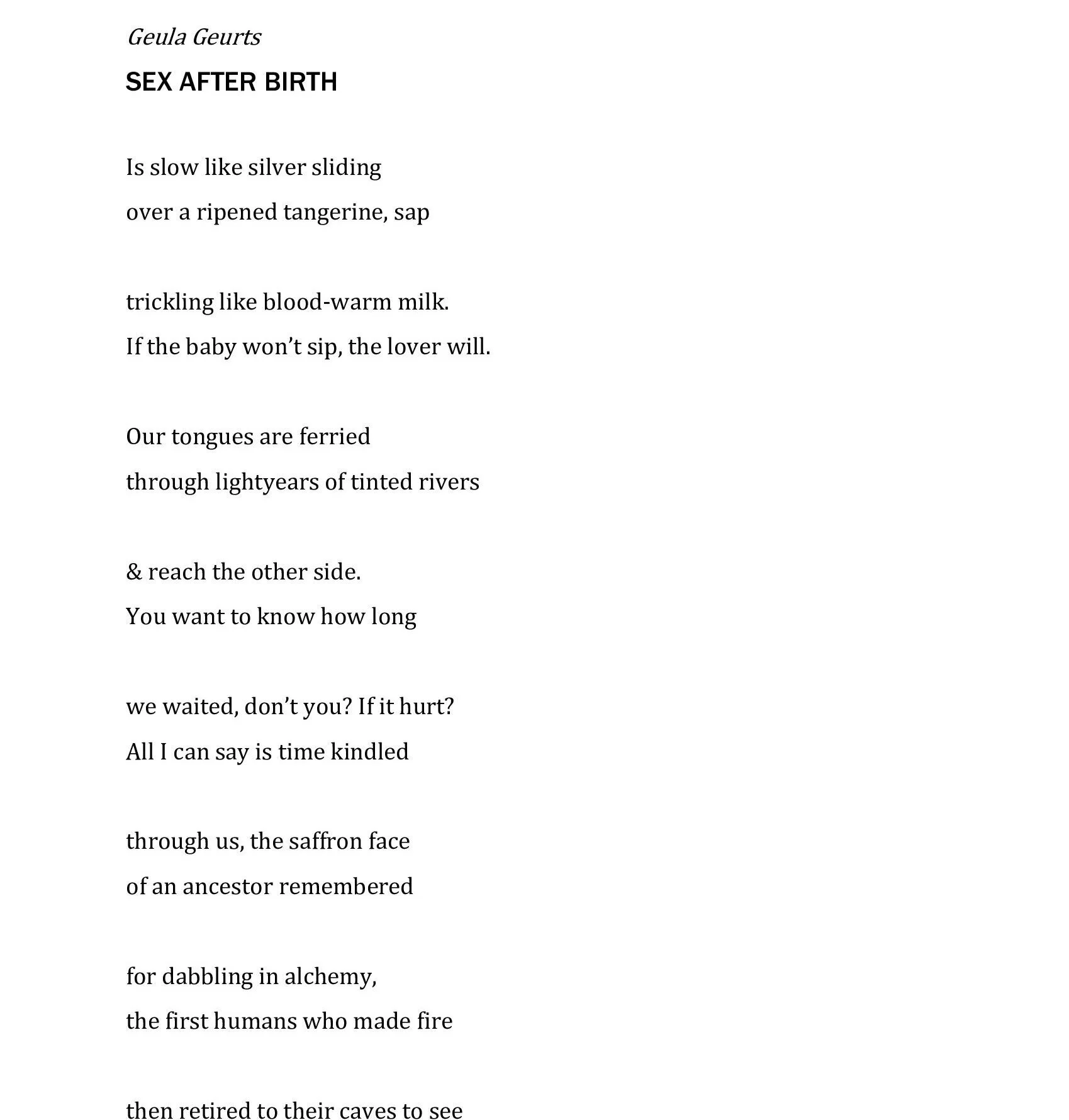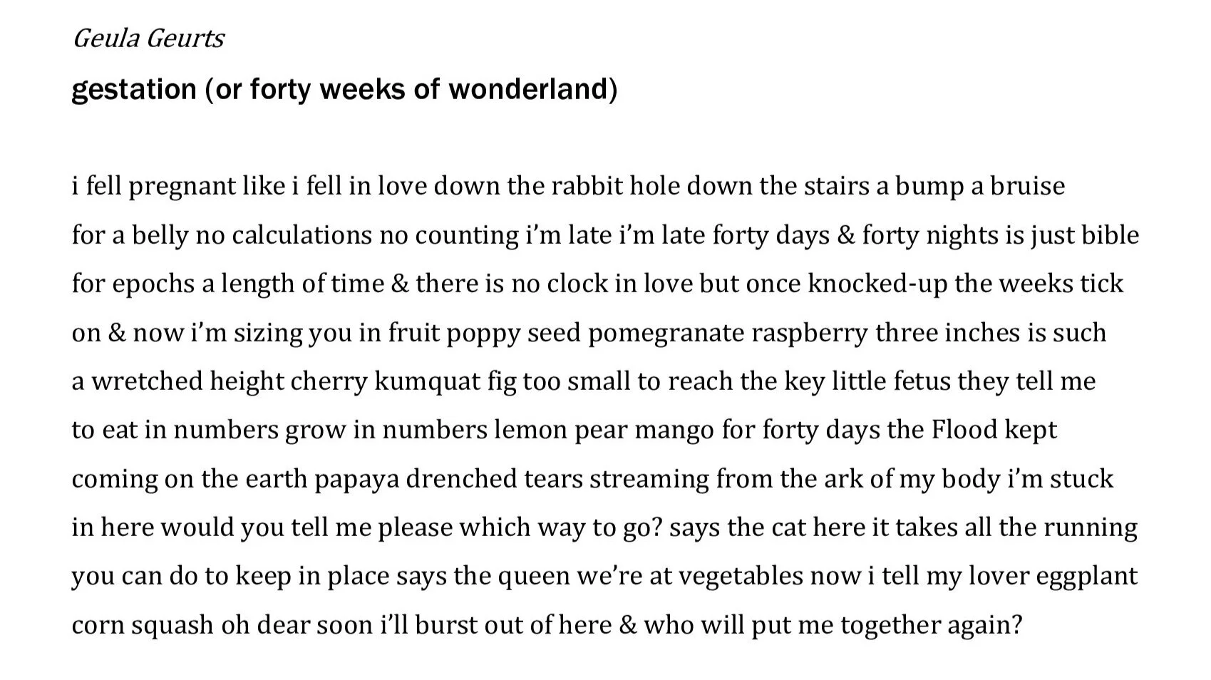 Geula Geurts is a Dutch born poet and essayist living in Jerusalem. She is a graduate of the Shaindy Rudolph Graduate Program in Creative Writing at Bar Ilan University. Her mini-chap 'Like Any Good Daughter' was published by Platypus Press. She was a finalist in the 2018 Autumn House Chapbook Contest. Her work has recently appeared or is forthcoming in Pleiades, Crab Creek Review, Blood Orange Review, New South, Tinderbox Editions, Blue River Review and Counterclock, among others. She works as a literary agent at the Deborah Harris Agency.