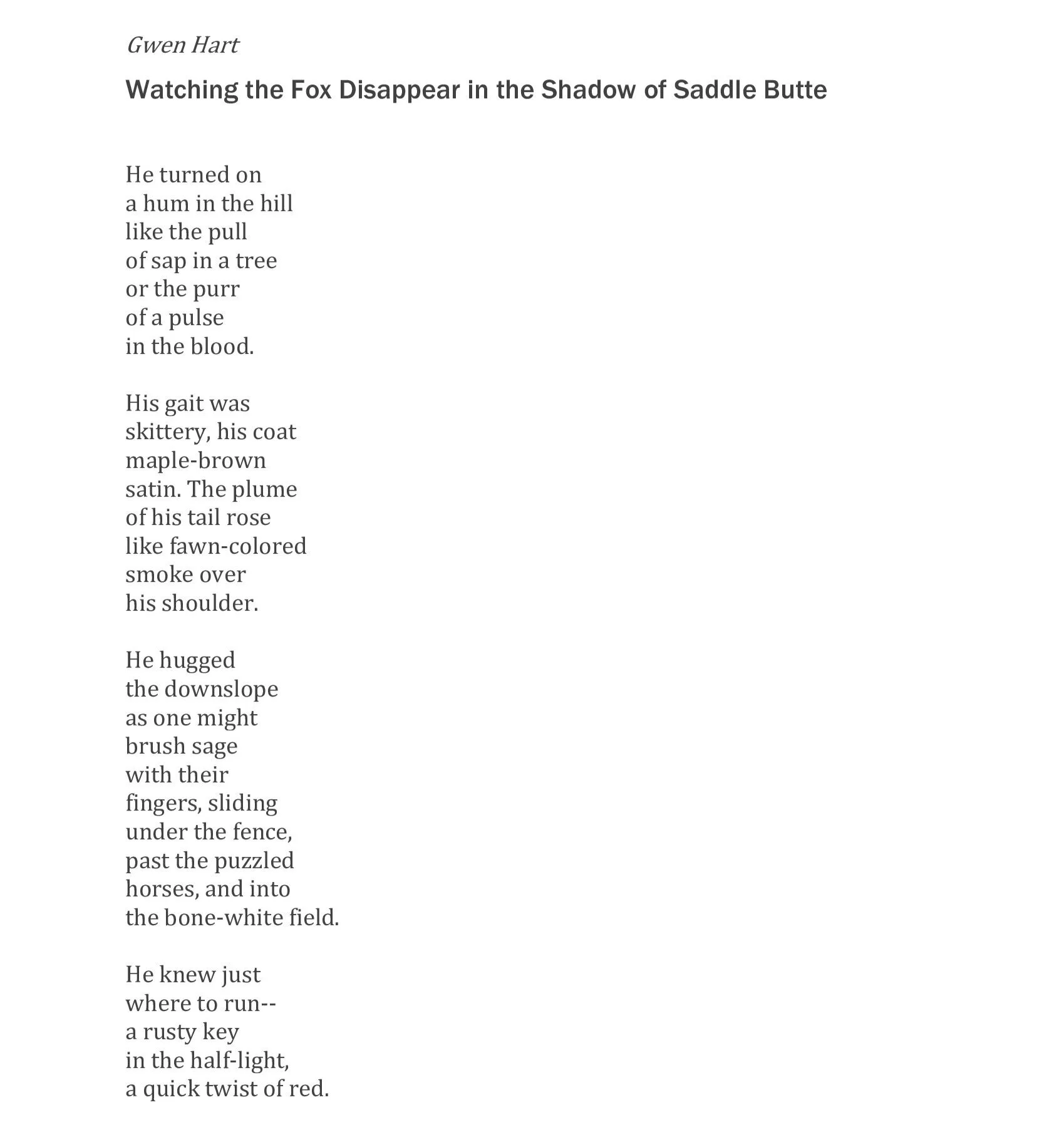 Gwen Hart teaches writing at Montana State University Northern. Living on Montana's Hi-Line has provided many topics for poems. Characters such as the fox, the tumbleweed, horses, and the cows that free-range in the Bear Paw Mountains have made appearances in her recent work. Her second poetry collection, The Empress of Kisses, won the X.J. Kennedy Poetry Prize from Texas Review Press. Her poems have appeared recently in Storm Cellar, Mud Season Review, and Great Lakes Review.