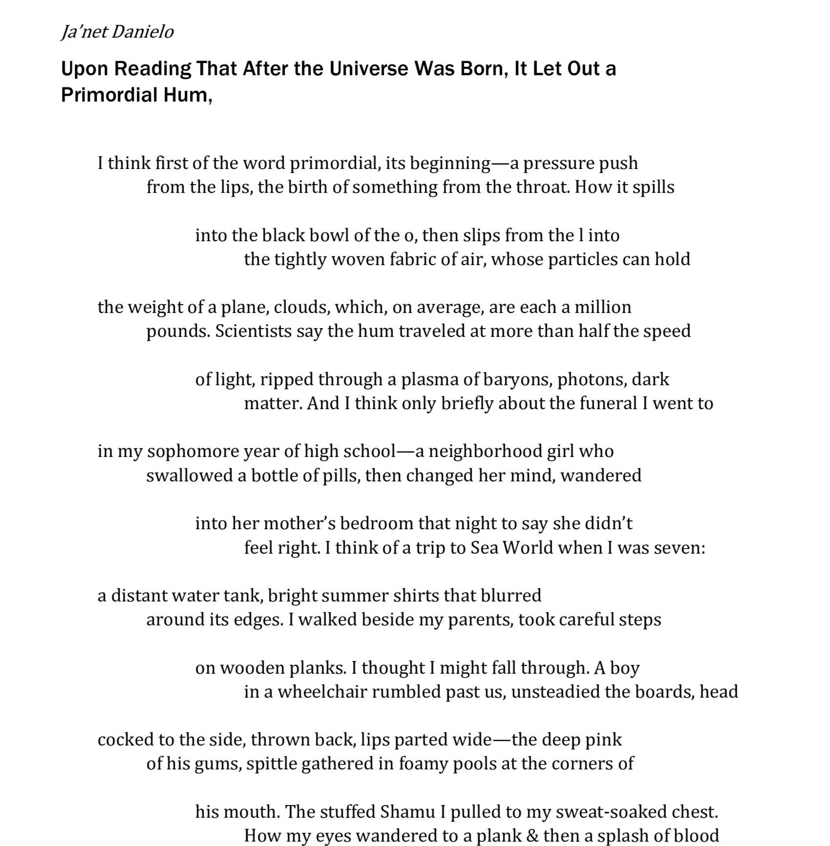 Ja’net Danielo’s prize-winning poem, “Upon Reading That After the Universe Was Born, It Let Out a Primordial Hum,” opens with a meditation on the phonetic suggestiveness of the word primordial. The poem expands like its own universe, landing on funereal and difficult memories, cutting them with pop culture references like Snafu the Orca and Johnie Walker Black, juxtaposing living and dying with the presence of the hum—alive, still, in Einstein’s space as time. The choice of indented couplets for the form of this poem gestures to the architected platforms skillfully woven throughout this piece, that move and shift with the proximity of death. Time captured in Danielo’s piece matter; they are never lost in the cosmic gravity of her poem.