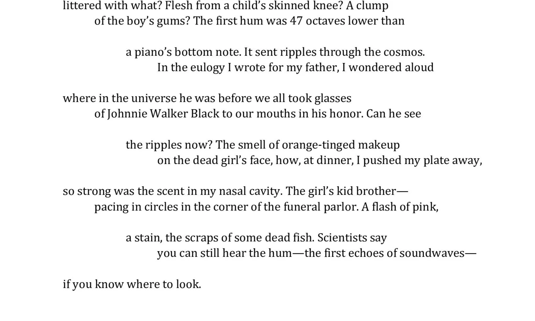 This poem, like so many others I’ve written, was initially inspired by an article I read, in this case, about the first sound the universe ever made, evidenced by ripples in the plasma of baryons, photons, and dark matter through which it traveled. I thought of a series of events throughout my life that have caused their own ripples, their echoes ever-present. The poem’s structure, title, and first line draw from John Murillo’s “Upon Reading That Eric Dolphy Transcribed Even the Calls of Certain Species of Birds,” a poem whose sounds live in my body like no other.