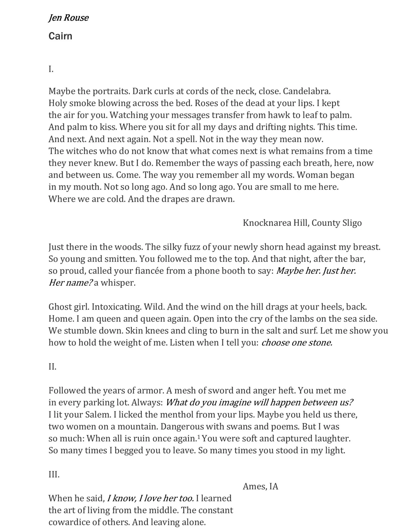 Jen Rouse is the Director of the Center for Teaching and Learning at Cornell College. Her work has appeared in Poet Lore, Poetry, The Citron Review, Pithead Chapel, Cleaver, Always Crashing, Mississippi Review, and elsewhere. Headmistress Press has published her books Acid and Tender, CAKE, and Riding with Anne Sexton.