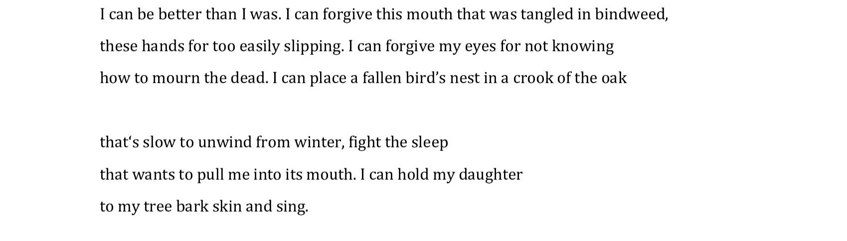 from River Heron Poetry Prize final judge, Shankar Narayan: “This poem unfurls its conflicting emotions like the fronds of some unknown fern, leading to both despair and elation in equal measure. The initial evocation of a three-way split personality lends the poem power and urgency from the very beginning, yet its narrative voice moves forward with a light touch, taking the reader along on its enacted emotional polarities and ultimately, winning them over. The poem’s direct voice can be devastating at times (“[f]ollow me down the stairs to the place of weeping”) but is unflinchingly honest regardless. The poem’s struggle is specific, yet it stands in for so many of our struggles with our bodies, our relationships, and our selves, particularly in the current pandemic world. And in the end, the poem’s claim of connection with and succor within natural spaces and non-human beings reminds us of the powerful healing to be found there.”