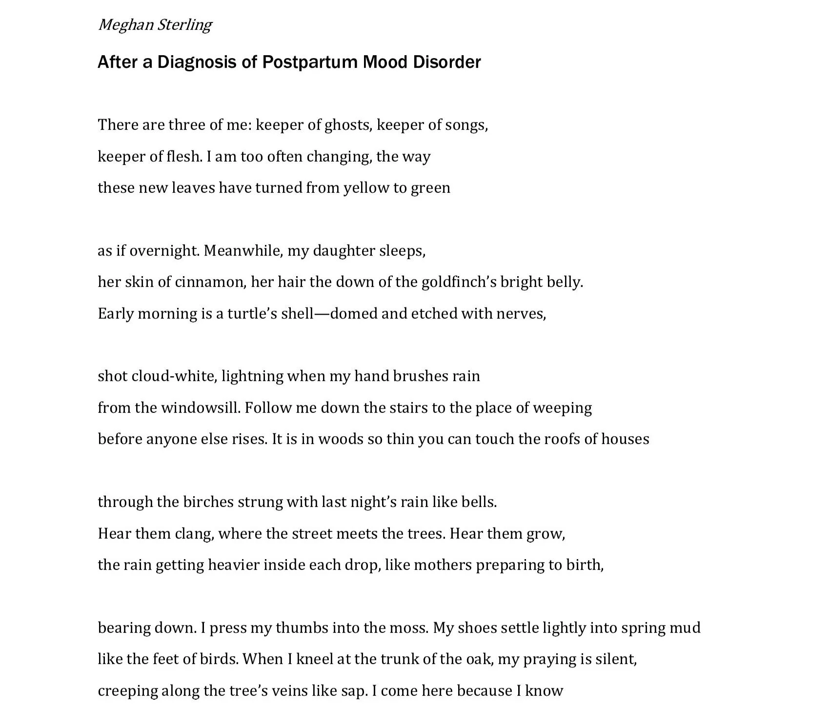 Meghan Sterling lives in Portland, Maine. Her work has been published or is forthcoming in Rattle, Rust & Moth, SWIMM, The Night Heron Barks, Cider Press Review, Inflectionist Review, Sky Island Journal, Westchester Review, Pine Hills Review, Mom Egg Review, Menacing Hedge and many others. She is Associate Poetry Editor of the Maine Review, and winner of Sweet Literary's 2021 annual poetry contest. Her collection These Few Seeds is out now from Terrapin Books.
