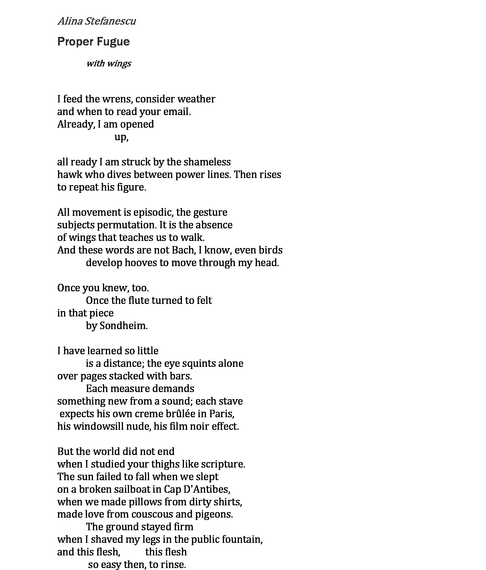 “Encompassing heartbreaking personal narrative, self-exploration, classical music, natural imagery, and musings on the composition process itself, “Proper Fugue” is hard-to-pin-down. It’s bold, epic, tense, melodic, and, above all, filled with truth. The line breaks lead us off cliffs. Phrases like “It is the absence / of wings that teaches us to walk.” and “I have learned so little / is a distance” demand our full attention, filling us with inherently unanswerable questions that feel, despite their abstract nature, intimately human…and perhaps even answerable.”