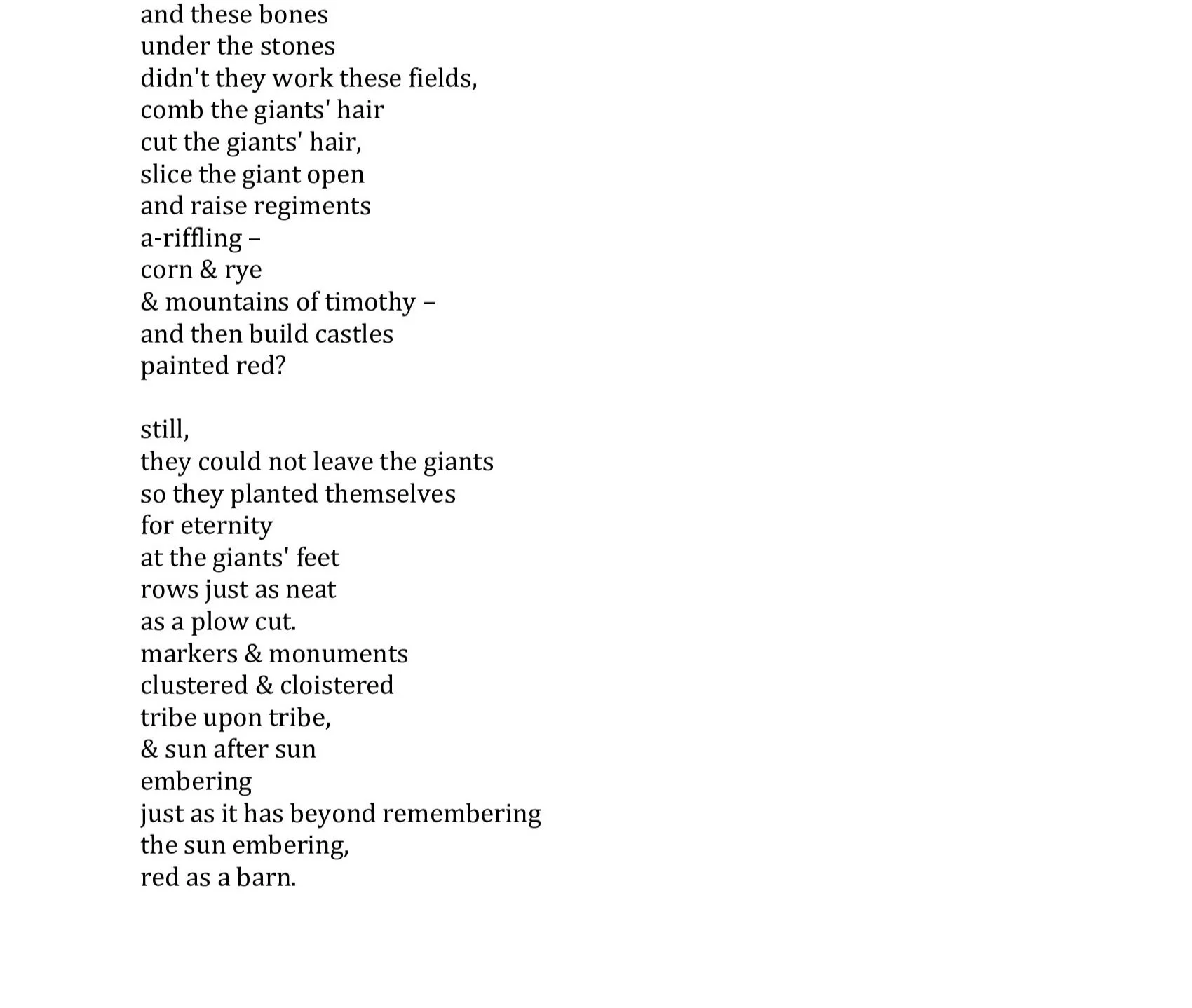 One of the most compelling elements of this poem is the perception of red. The poem opens with an image of barns “red/as the coats/who wanted those barns/under a throne.” Those barns flare and fade throughout the poem as the history of place unspools. But by the end, through time’s passage and the unstacking of historical layers, the red sun is the most prominent image. In the final comparison, barns are no longer the subject compared to something else; they become a way of seeing the sun “embering/red as barn.” The red barns become a way of seeing a much larger troubling history of everyone who has owned and worked and struggled in and because of those barns, markers of stolen land, ways of living that define people and place.