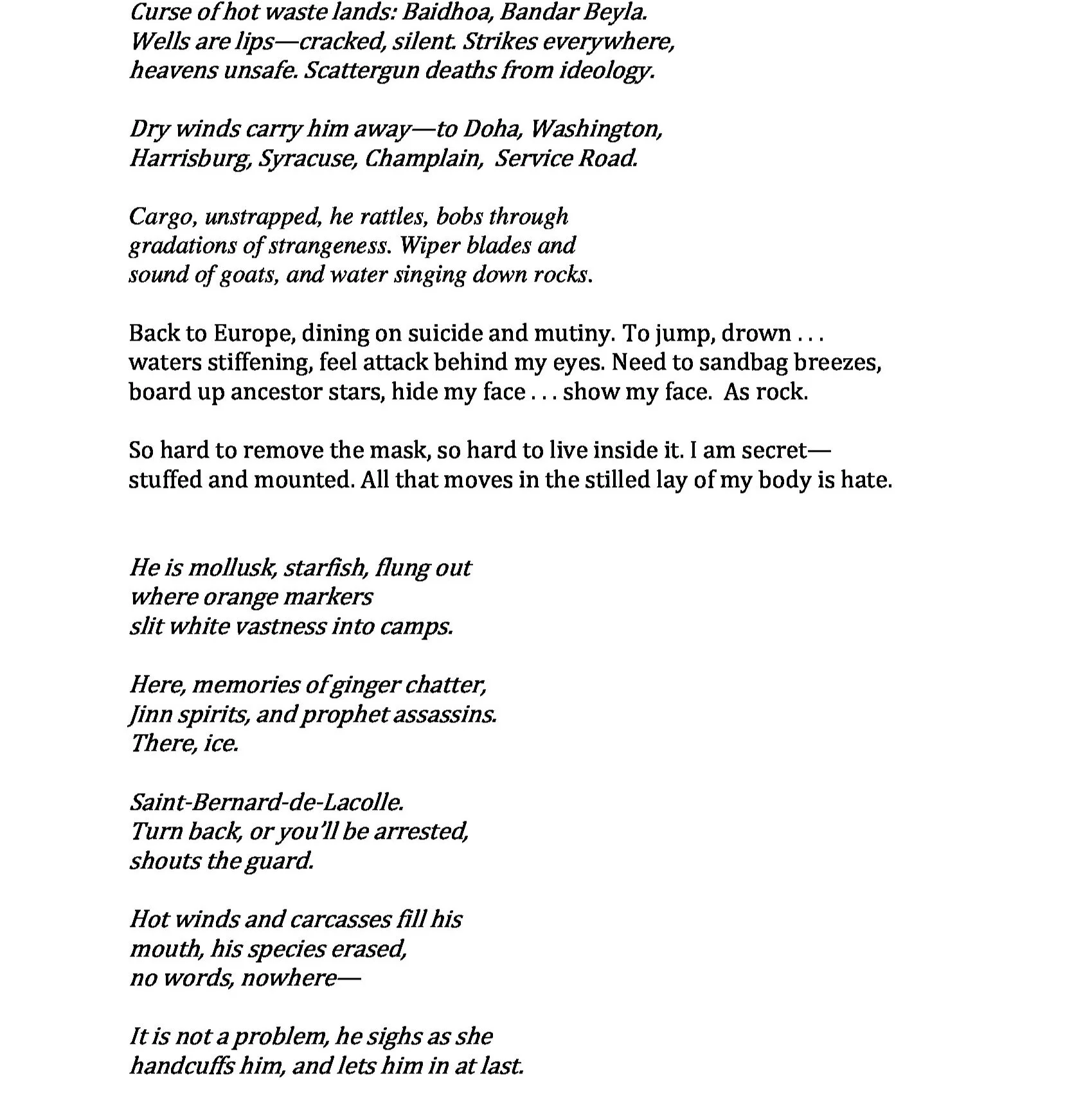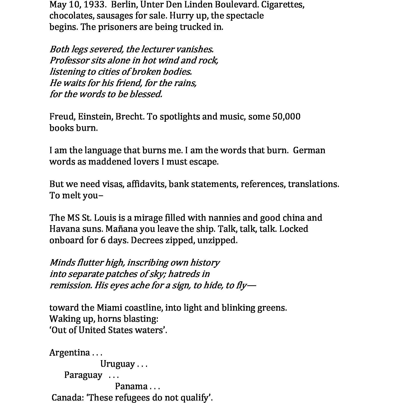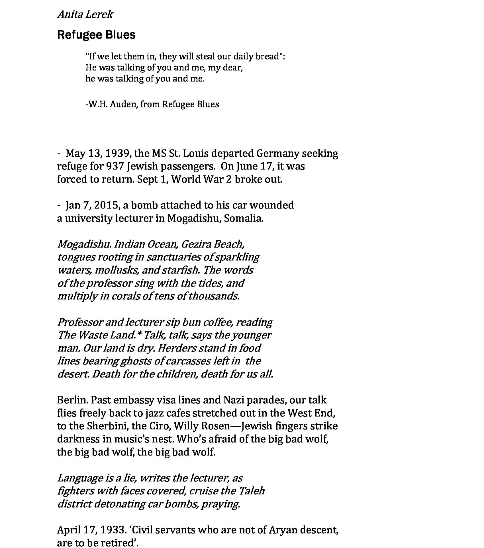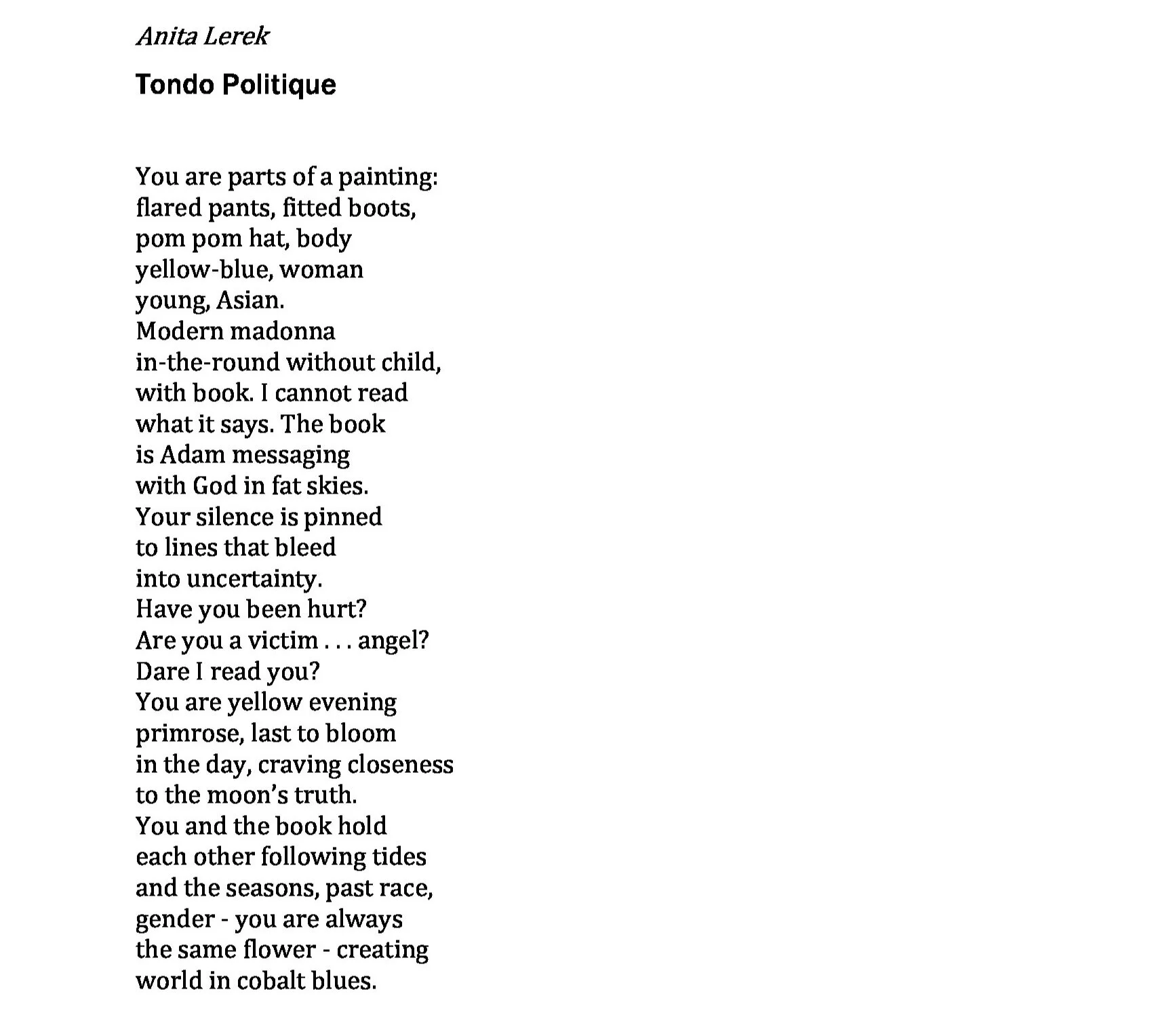 Anita Lerek was born in Warsaw, Poland to exhausted Jewish survivors of the Holocaust. Unable to gain entry to the United States, the family created a new life in Canada. She has always lived and written through the filter of the ‘other’. Hence in ‘Refugee Blues’ the conflation of German-Jewish and Somali outsiders. Hence the question posed in ‘Tondo Politique’: Who dares to ‘read’ the outsider. As Lerek puts it, “You are always the same flower.” A lawyer (non-practising) and entrepreneur, she is a publishing late-bloomer, with recent/forthcoming poem credits here in River Heron, as well as in Offcourse, Verse-Virtual, and Poetry Super Highway (Poet of the Week). She resides with her archivist husband in Toronto.