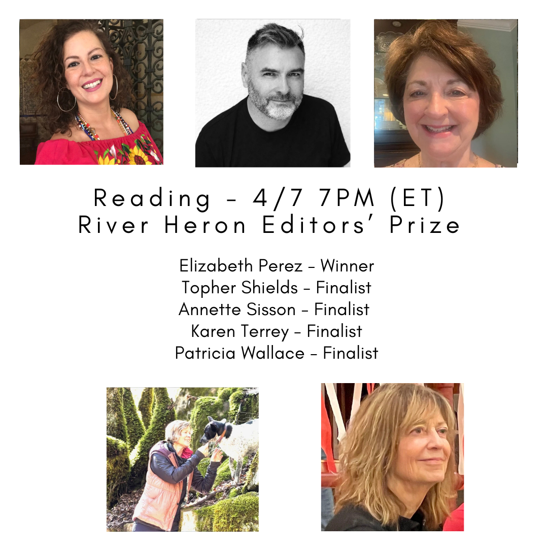 Join us for a special poetry reading celebrating the winner and finalists of The River Heron Editors’ Prize! Don’t miss this chance to hear the poems live and celebrate this year’s honorees.