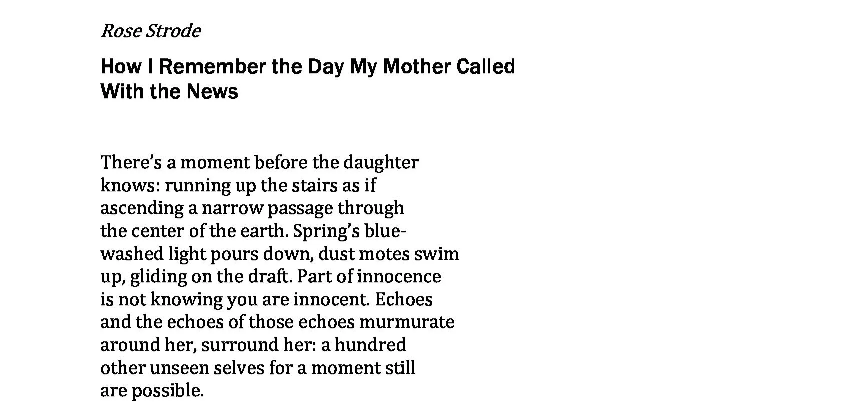Rose Strode is a poet and essayist whose recent work appears in la piccioletta barca, Dillydoun, Sugar House Review, New Ohio Review, The Florida Review, and Kestrel. She is a recipient of the Gulick Fellowship at Valparaiso University, a master gardener, and an editor at Stillhouse Press. When not writing or helping others with their writing, Rose rehabilitates old, overgrown gardens. Her favorite tools are her eraser and her pruning shears.