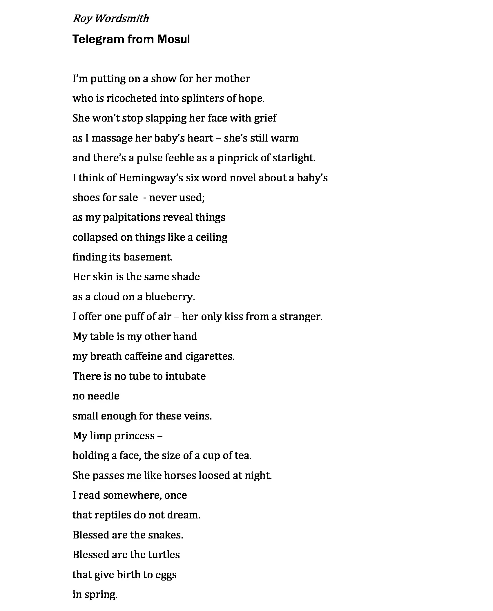 Roy Wordsmith fishes for poems in dark corners of neglected attics, sodden basements and fields with one lone tree. A blind woman binds his journey - which upon circling back to where he started, he may find the fish or word or image for which he was searching. For Roy imagination is more important than knowledge - more important than degrees or titles or salary. Children speak wisdom, tire tracks don't lie, and cats bring dreams of magic.