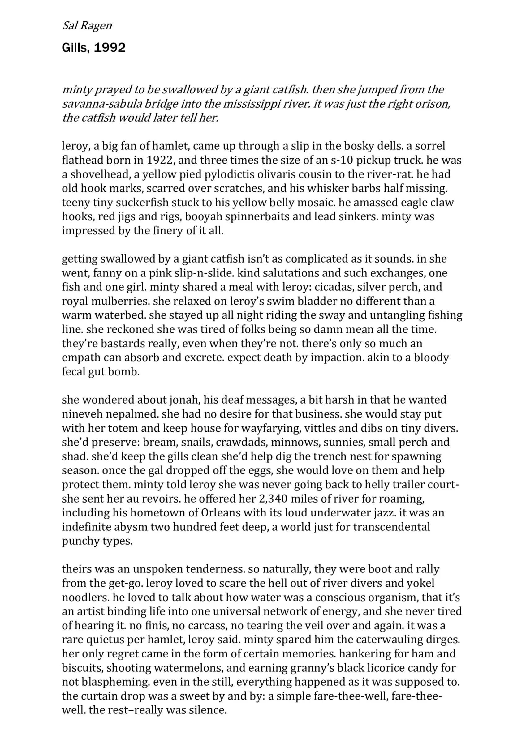 Sal Ragen lives in Central Arkansas with her family of cats and dogs and her partner. She is at work on a novel.