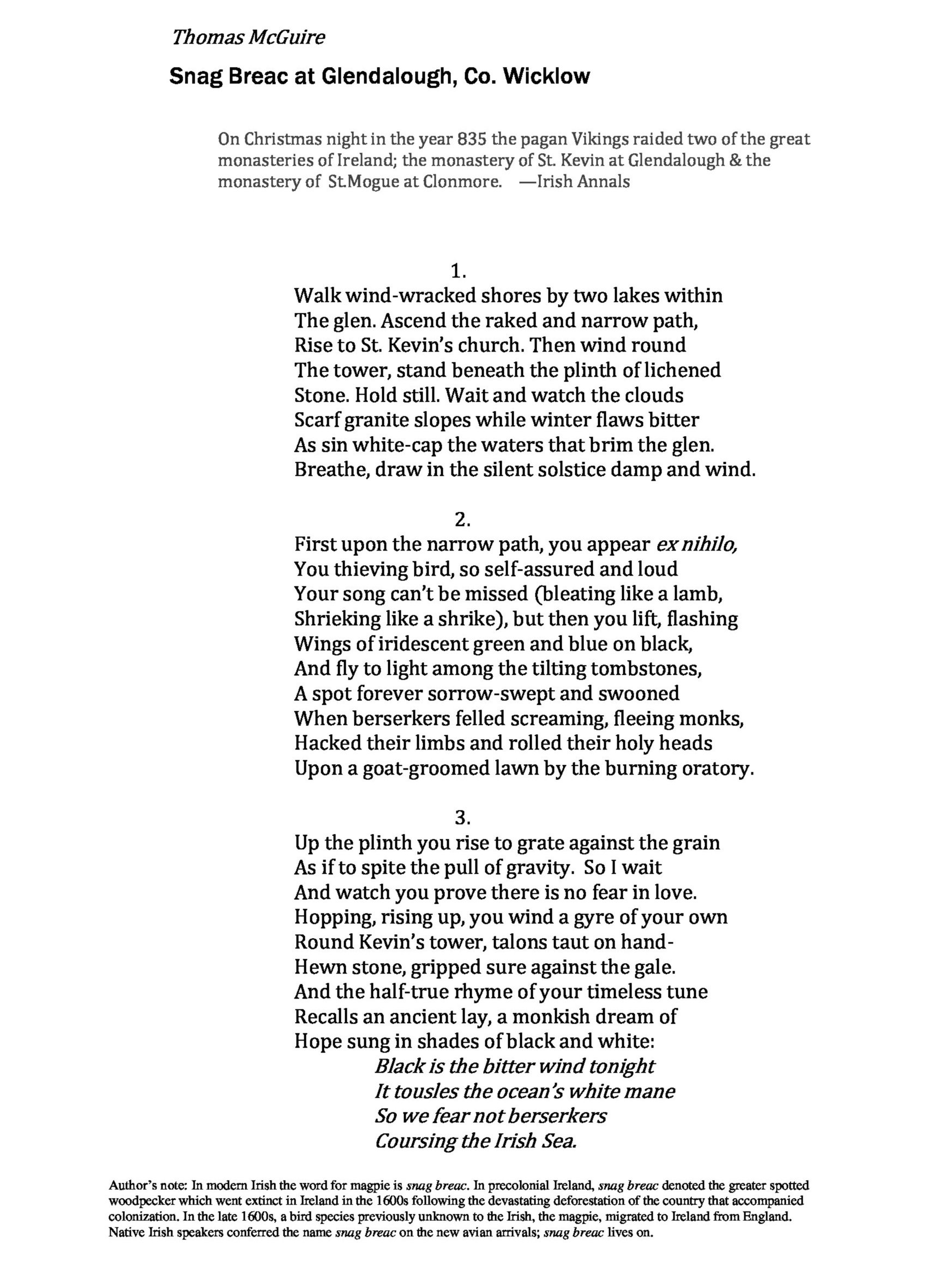 Thomas McGuire is a poet, essayist, translator, and literary scholar. His work has appeared in The Ekphrastic Review, North American Review, Zocalo Public Square, Southeast Review, River Heron, New Hibernia Review, Poetry for the More-Than-Human-World, and Open-Eyed, Full-Throated: An Anthology of American/Irish Poets. His poem "Four Ways of Looking at Magpie--A Most Becoming Bird" appeared in Best New Poets, 2020. He is a Professor of English at the U.S. Air Force Academy where he teaches Irish poetry and war literature. He also serves as the editor of War, Literature & the Arts. In 2008, he was a Fulbright Scholar to Ireland.
