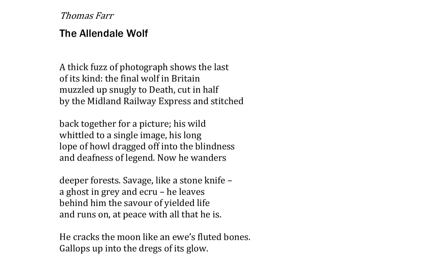 “The Allendale Wolf” was inspired by a photograph of a grey wolf that was killed on the railway in Carlisle in December 1904, some 30 miles west of the village of Allendale. I'd read an article on the possible reintroduction of wolves to the British countryside and found myself wondering about the wider implications of the species' return – about wilderness, and wild, and what, exactly, had been lost with the death of Britain's last wolf.