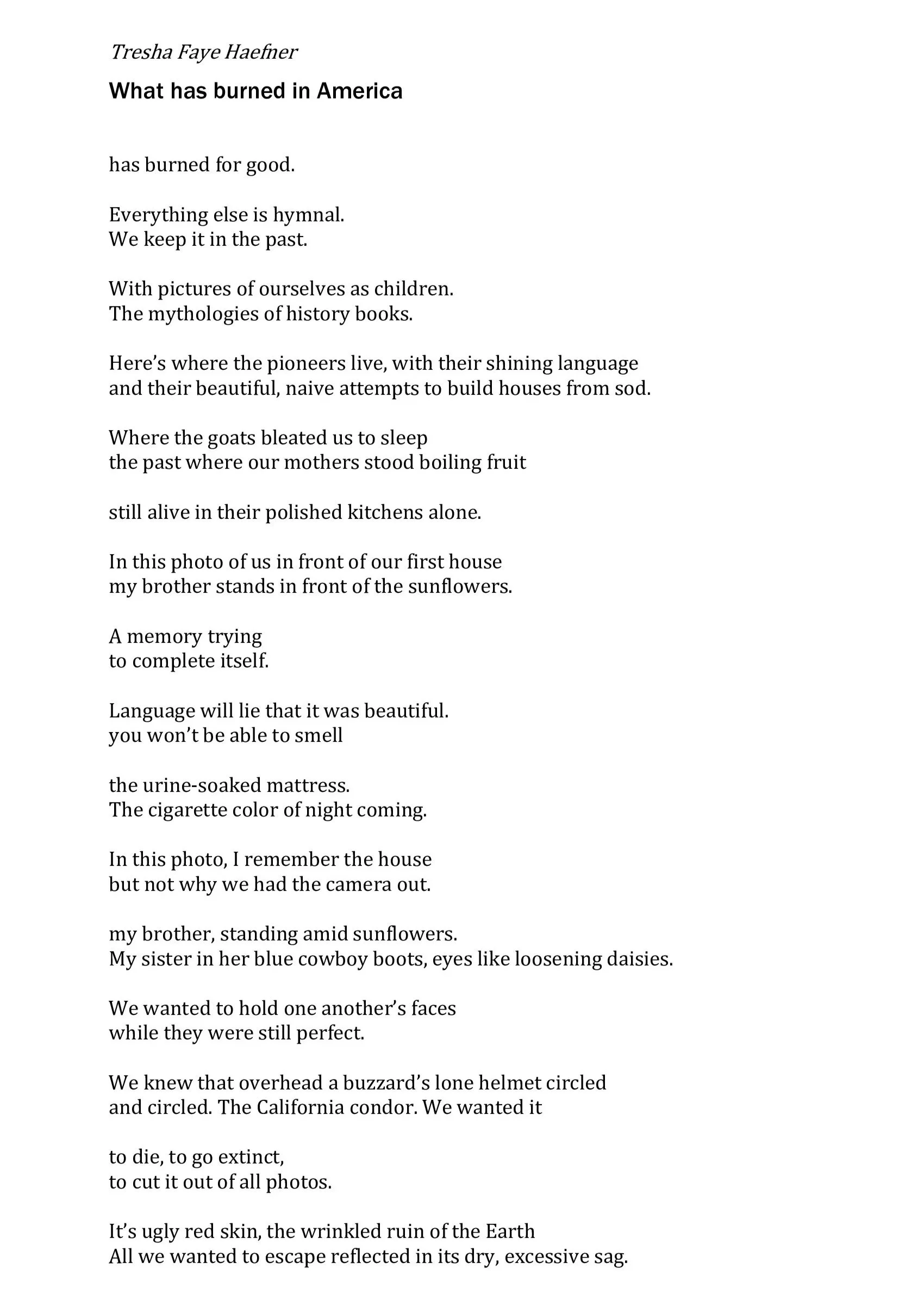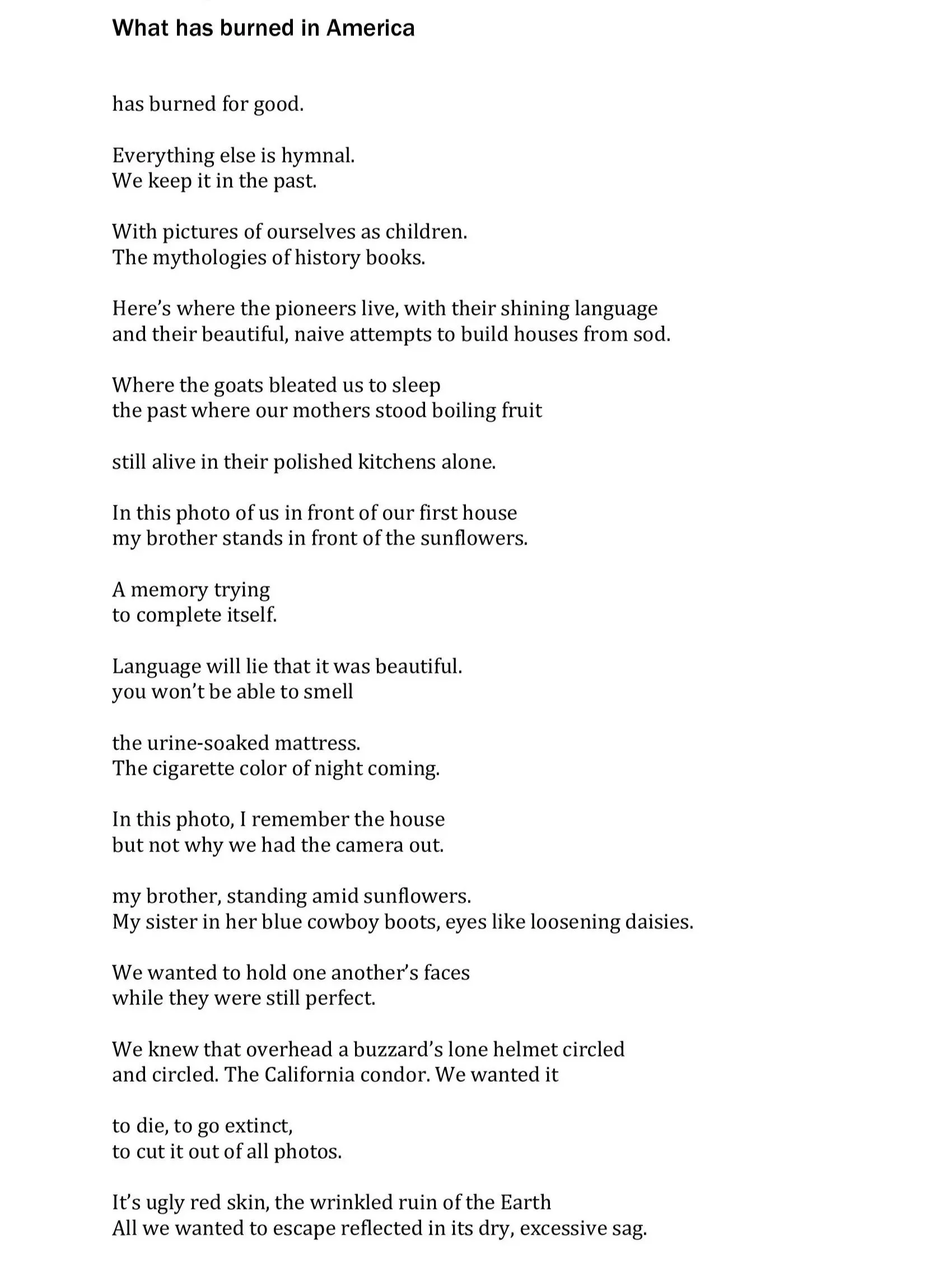 I grew up in the town of Paradise, CA, which burned down in the campfire of 2017 due to negligent behavior of PG&E. “What Has Burned in America…” is a meditation on both the destruction of the American environment, and the more specific aging of my family. Conversely, “Conversations with a baby” is written for my infant nephew who I hope will live in a safer, greener world.